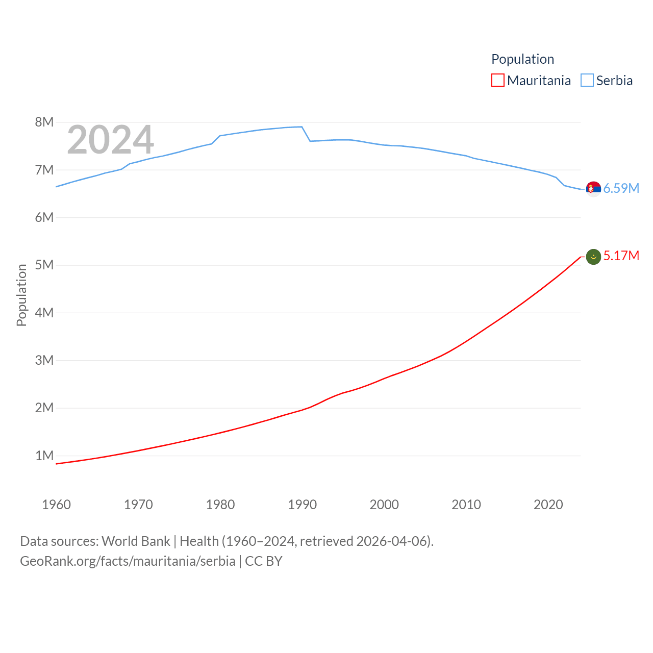 Mauritania has a population of 5.17M (ranked 125/197), compared with 6.59M in Serbia (ranked 109/197). Mauritania's land area is 397,955 sq mi versus 32,467 sq mi for Serbia (ranked 28th vs. 111th).