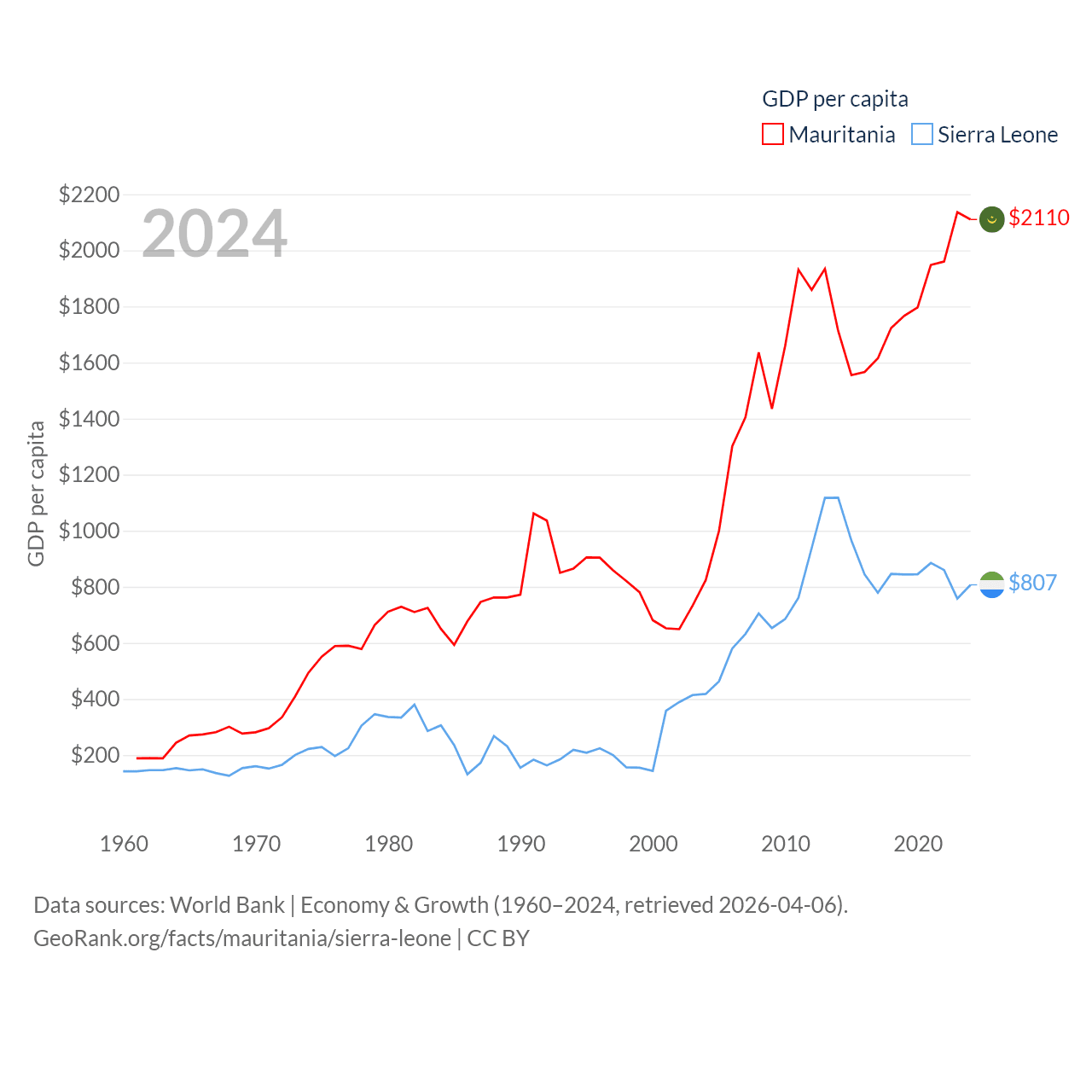 By GDP, Mauritania ranks 153/197 ($10.9B) and Sierra Leone ranks 160/197 ($6.97B). By GDP per capita, Mauritania ranks 156/197 ($2,110), while Sierra Leone ranks 186/197 ($807).