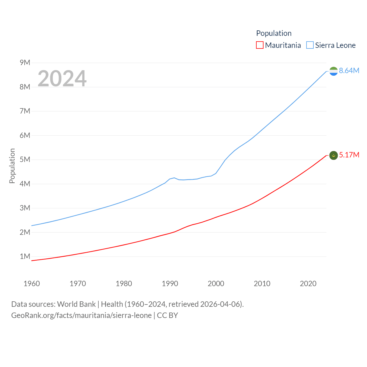 Mauritania has a population of 5.17M (ranked 125/197), compared with 8.64M in Sierra Leone (ranked 102/197). Mauritania's land area is 397,955 sq mi versus 27,869 sq mi for Sierra Leone (ranked 28th vs. 116th).