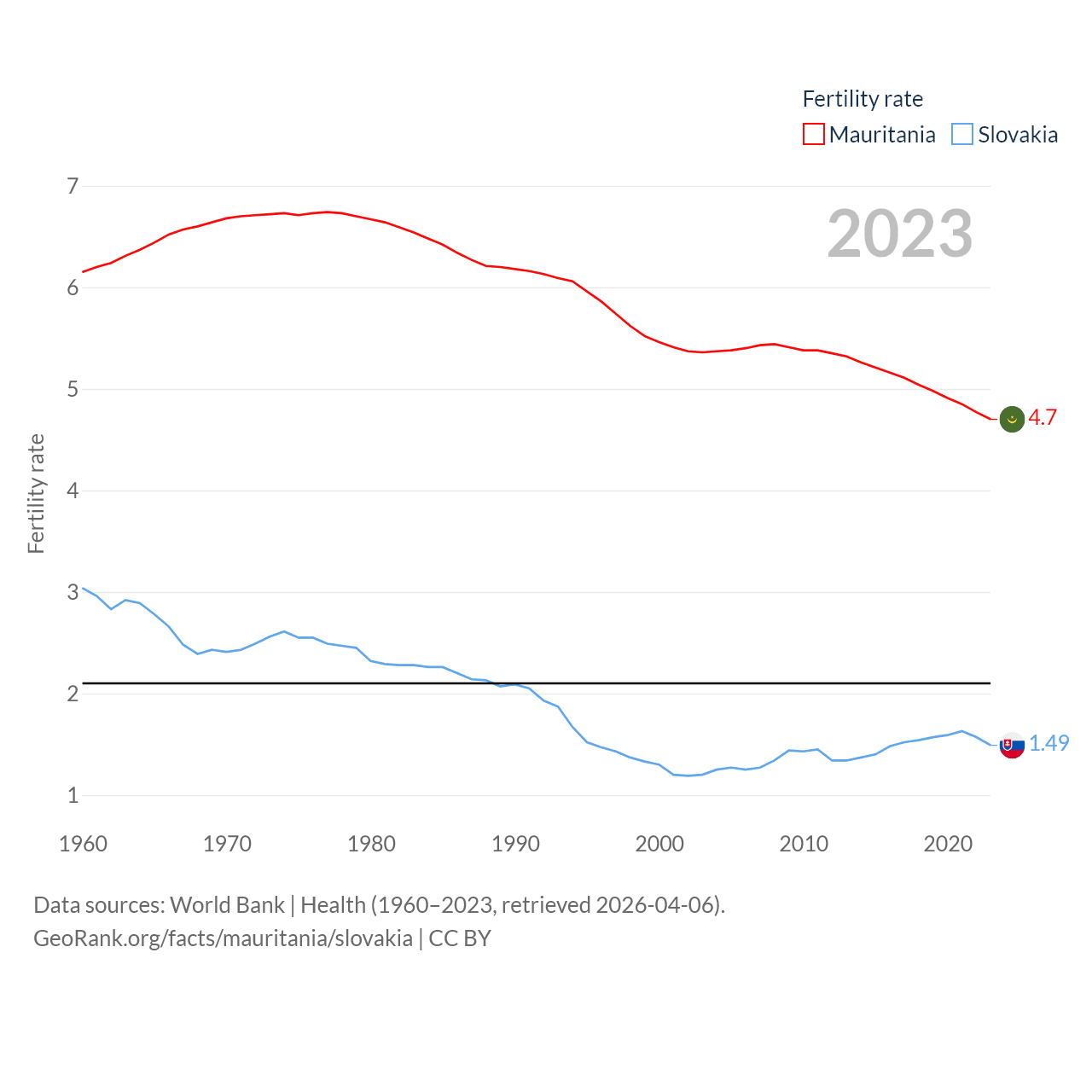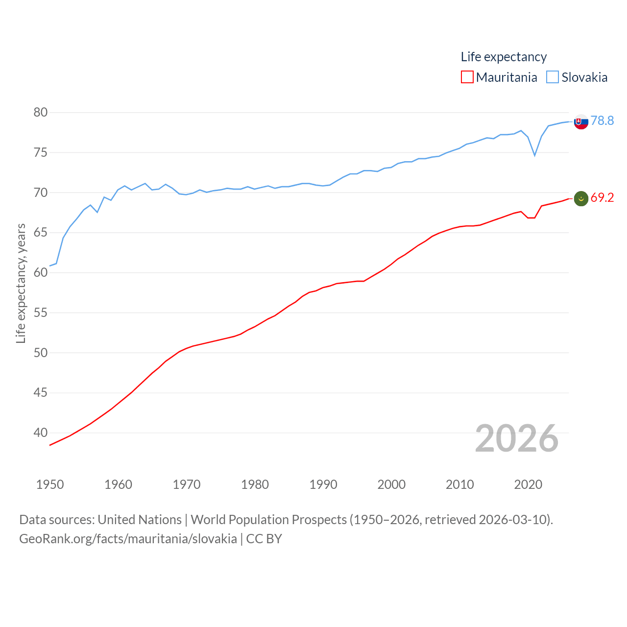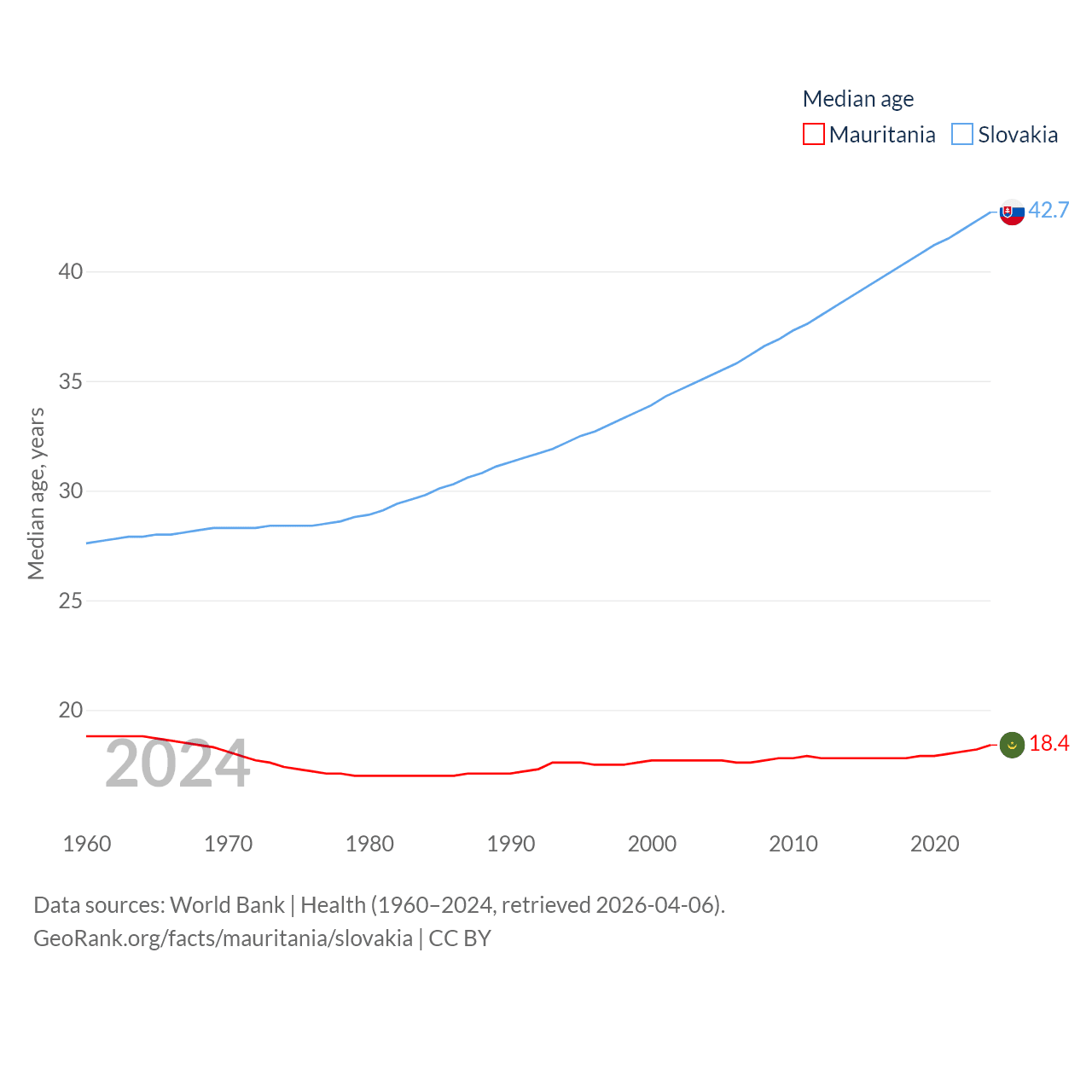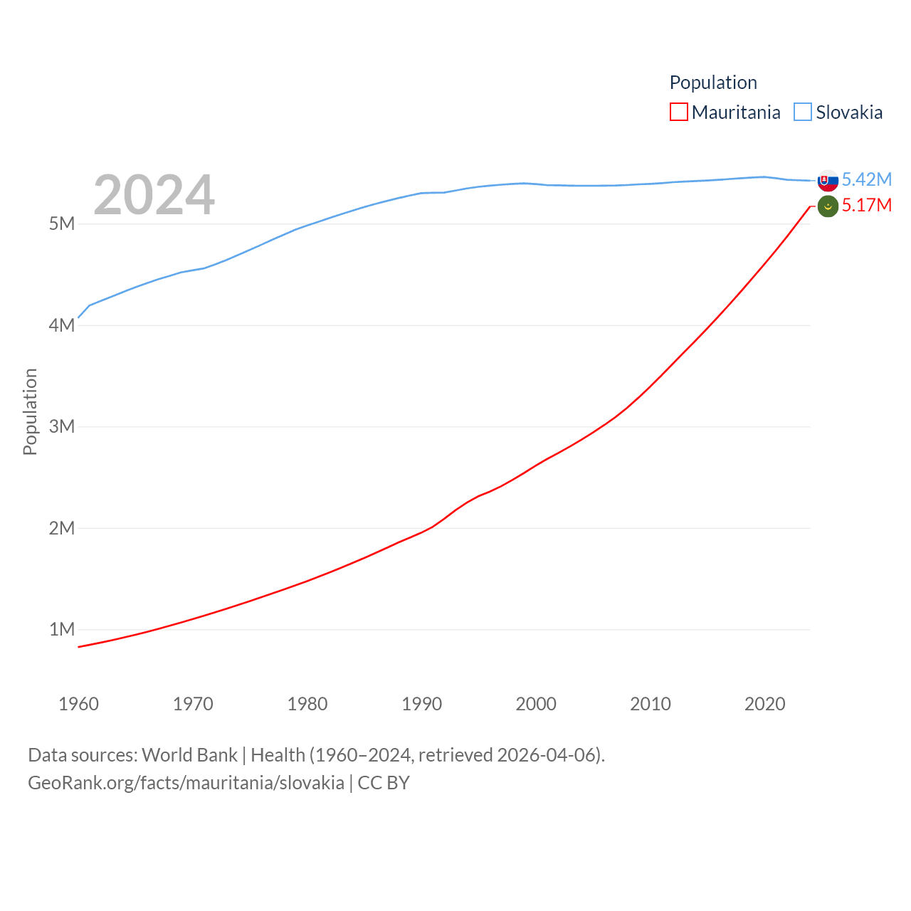 Mauritania has a population of 5.17M (ranked 125/197), compared with 5.42M in Slovakia (ranked 119/197). Mauritania's land area is 397,955 sq mi versus 18,564 sq mi for Slovakia (ranked 28th vs. 128th).