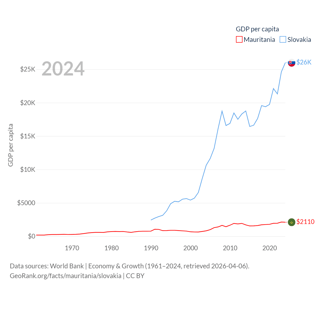 By GDP, Mauritania ranks 153/197 ($10.9B) and Slovakia ranks 61/197 ($141B). By GDP per capita, Mauritania ranks 156/197 ($2,110), while Slovakia ranks 47/197 ($25,993).