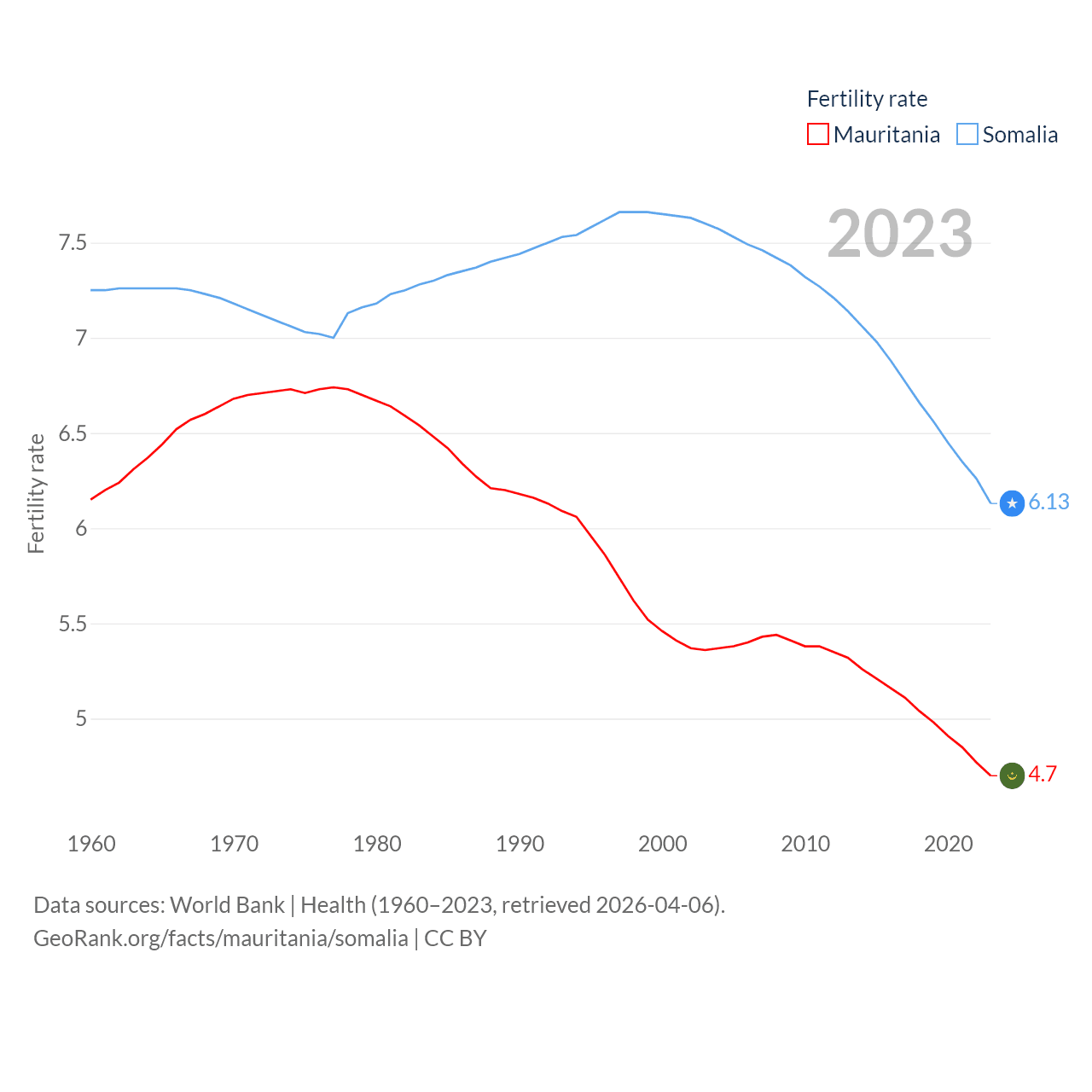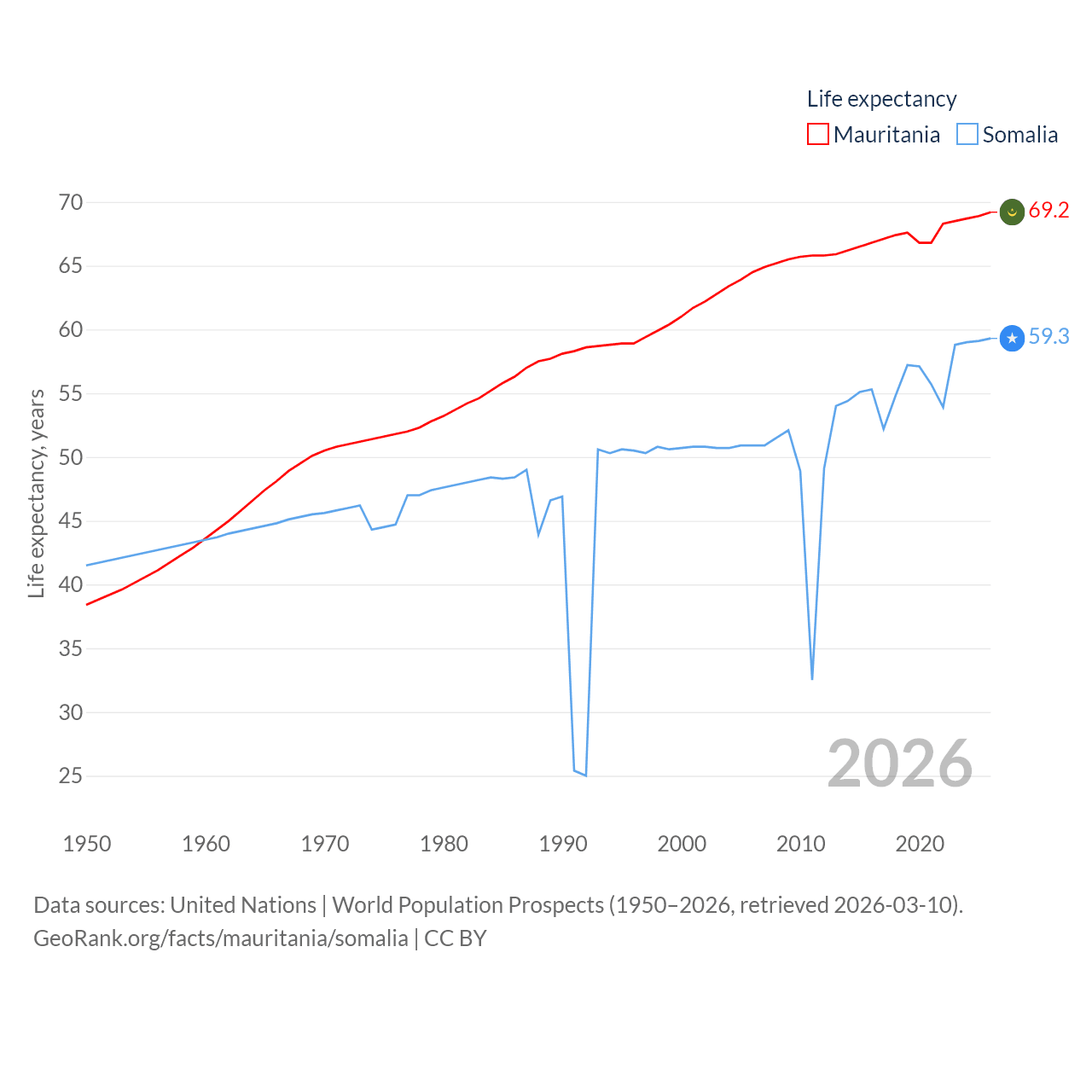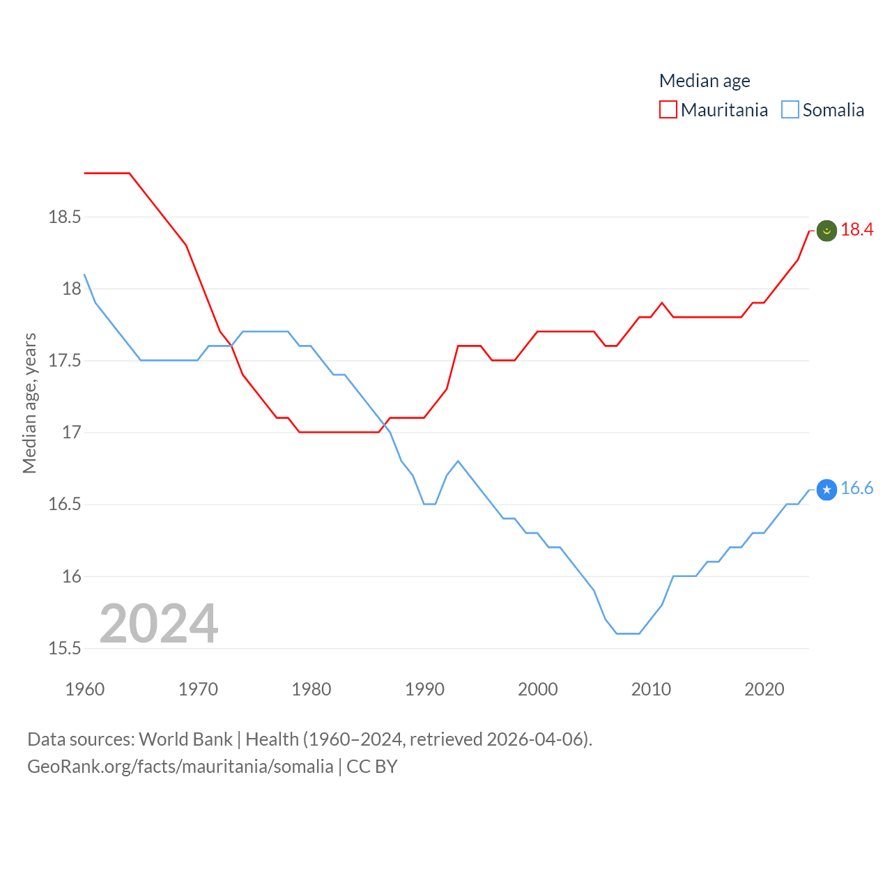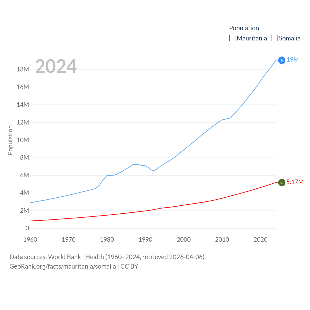 Mauritania has a population of 5.17M (ranked 125/197), compared with 19M in Somalia (ranked 68/197). Mauritania's land area is 397,955 sq mi versus 242,217 sq mi for Somalia (ranked 28th vs. 42nd).
