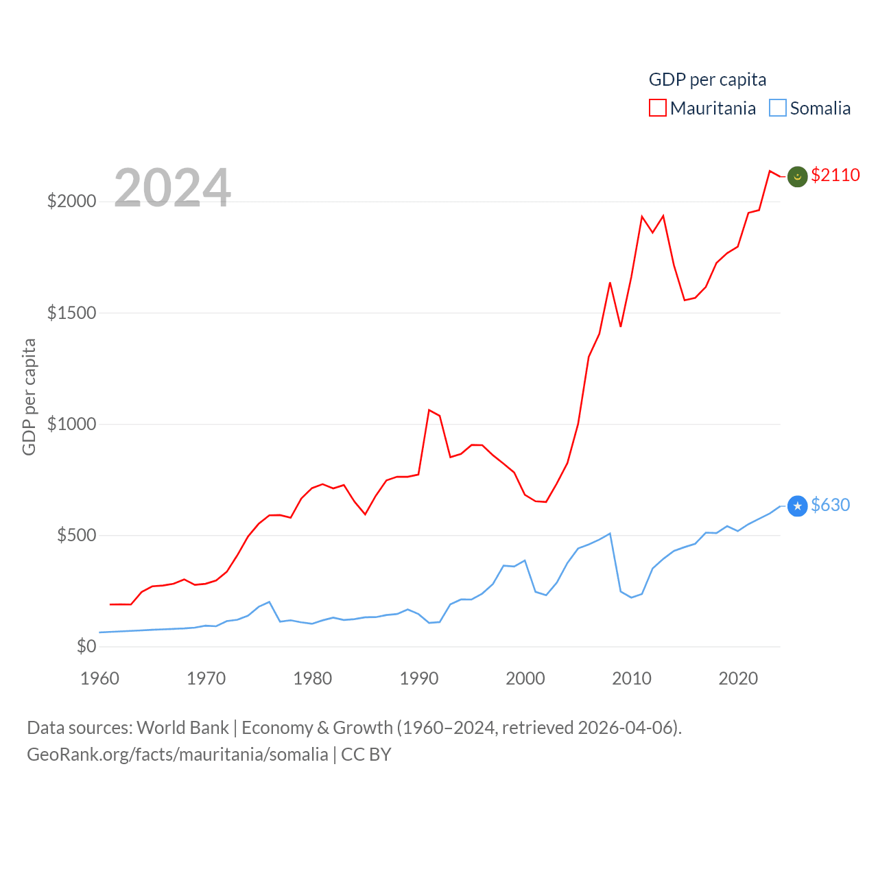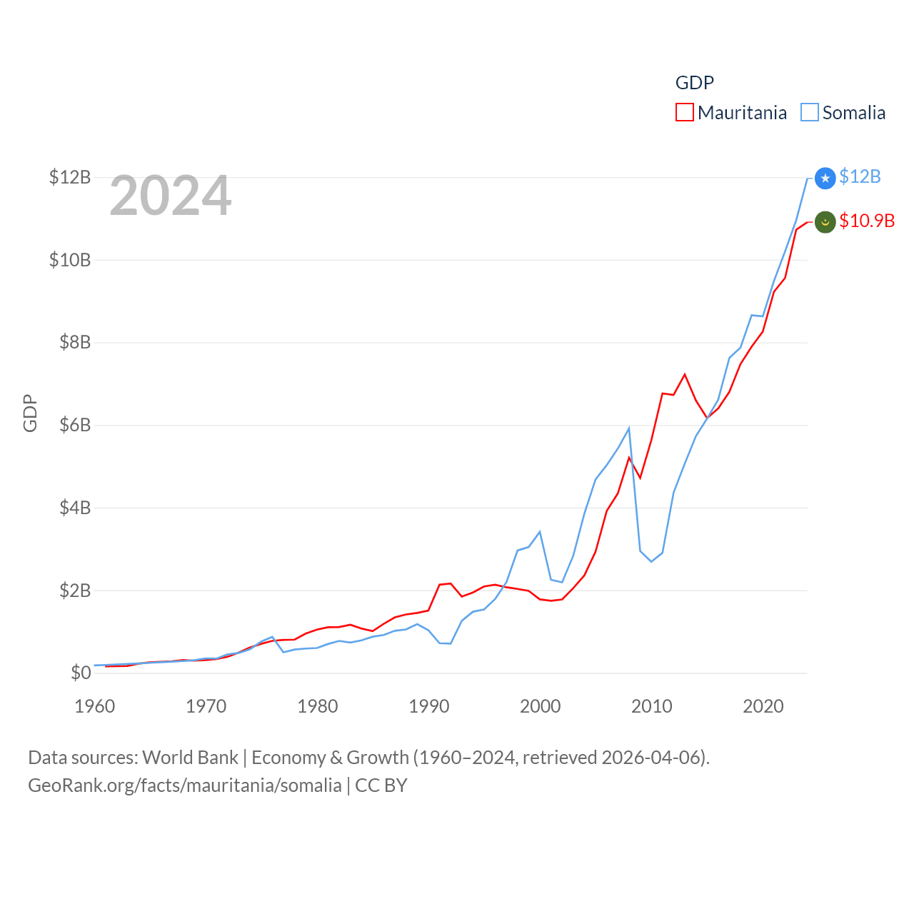 By GDP, Mauritania ranks 153/197 ($10.9B) and Somalia ranks 150/197 ($12B). By GDP per capita, Mauritania ranks 156/197 ($2,110), while Somalia ranks 192/197 ($630).