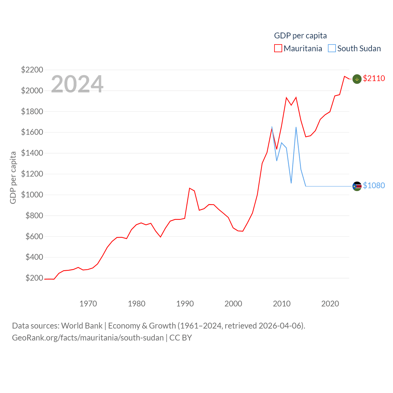 By GDP, Mauritania ranks 153/197 ($10.9B) and South Sudan ranks 149/197 ($12B). By GDP per capita, Mauritania ranks 156/197 ($2,110), while South Sudan ranks 175/197 ($1,080).