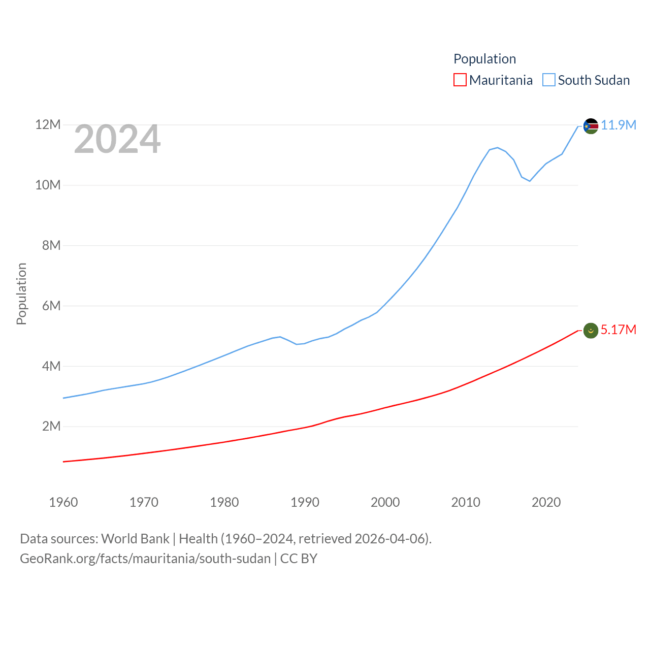 Mauritania has a population of 5.17M (ranked 125/197), compared with 11.9M in South Sudan (ranked 81/197). Mauritania's land area is 397,955 sq mi versus 243,990 sq mi for South Sudan (ranked 28th vs. 41st).