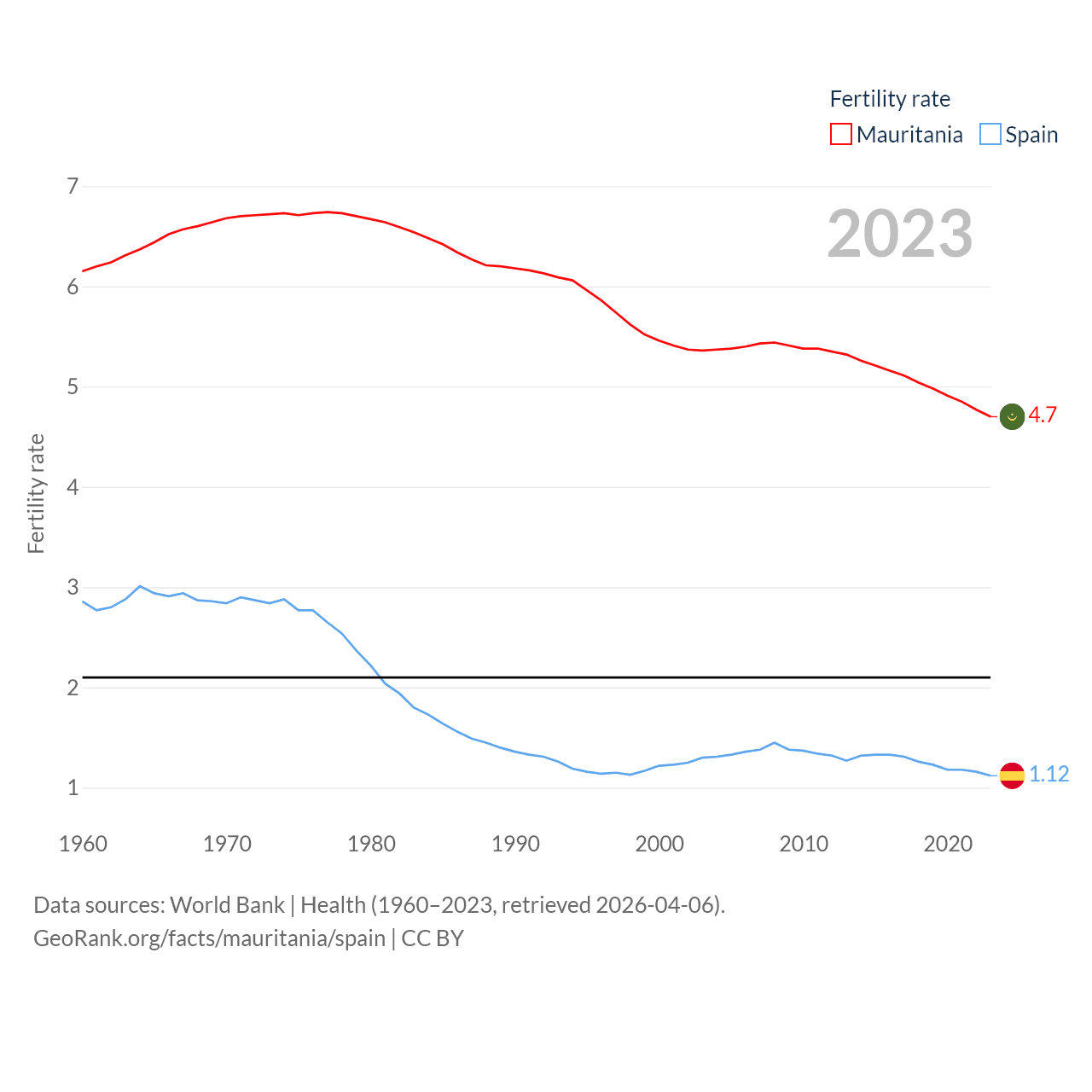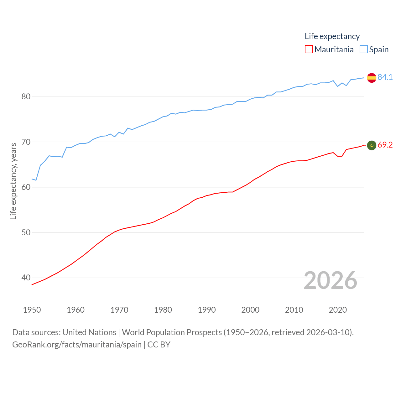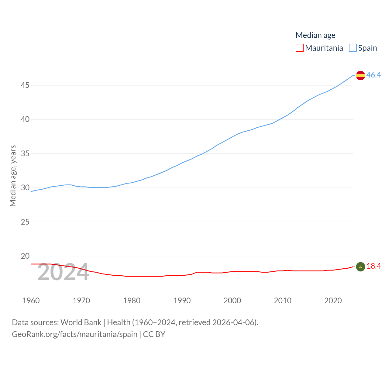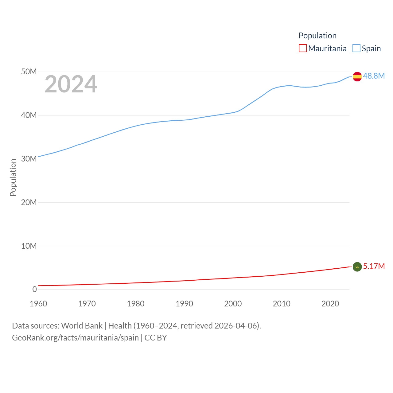 Mauritania has a population of 5.17M (ranked 125/197), compared with 48.8M in Spain (ranked 32/197). Mauritania's land area is 397,955 sq mi versus 192,934 sq mi for Spain (ranked 28th vs. 51st).
