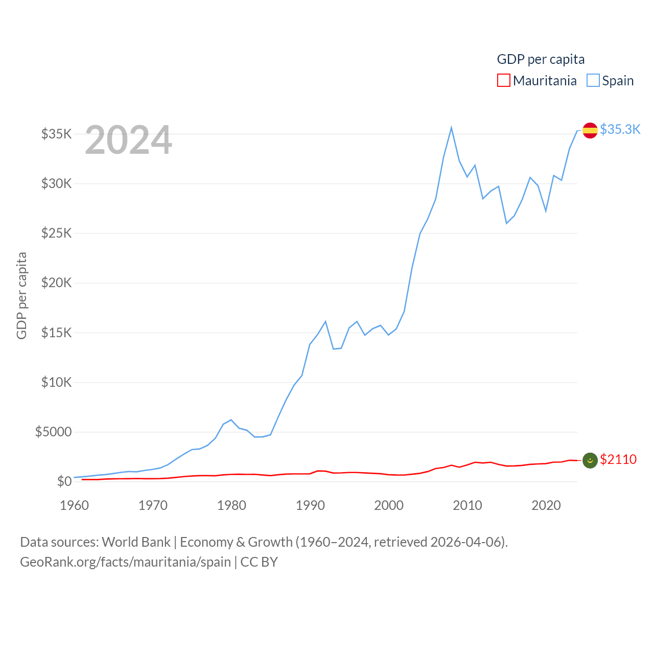 By GDP, Mauritania ranks 153/197 ($10.9B) and Spain ranks 15/197 ($1.73T). By GDP per capita, Mauritania ranks 156/197 ($2,110), while Spain ranks 32/197 ($35,327).