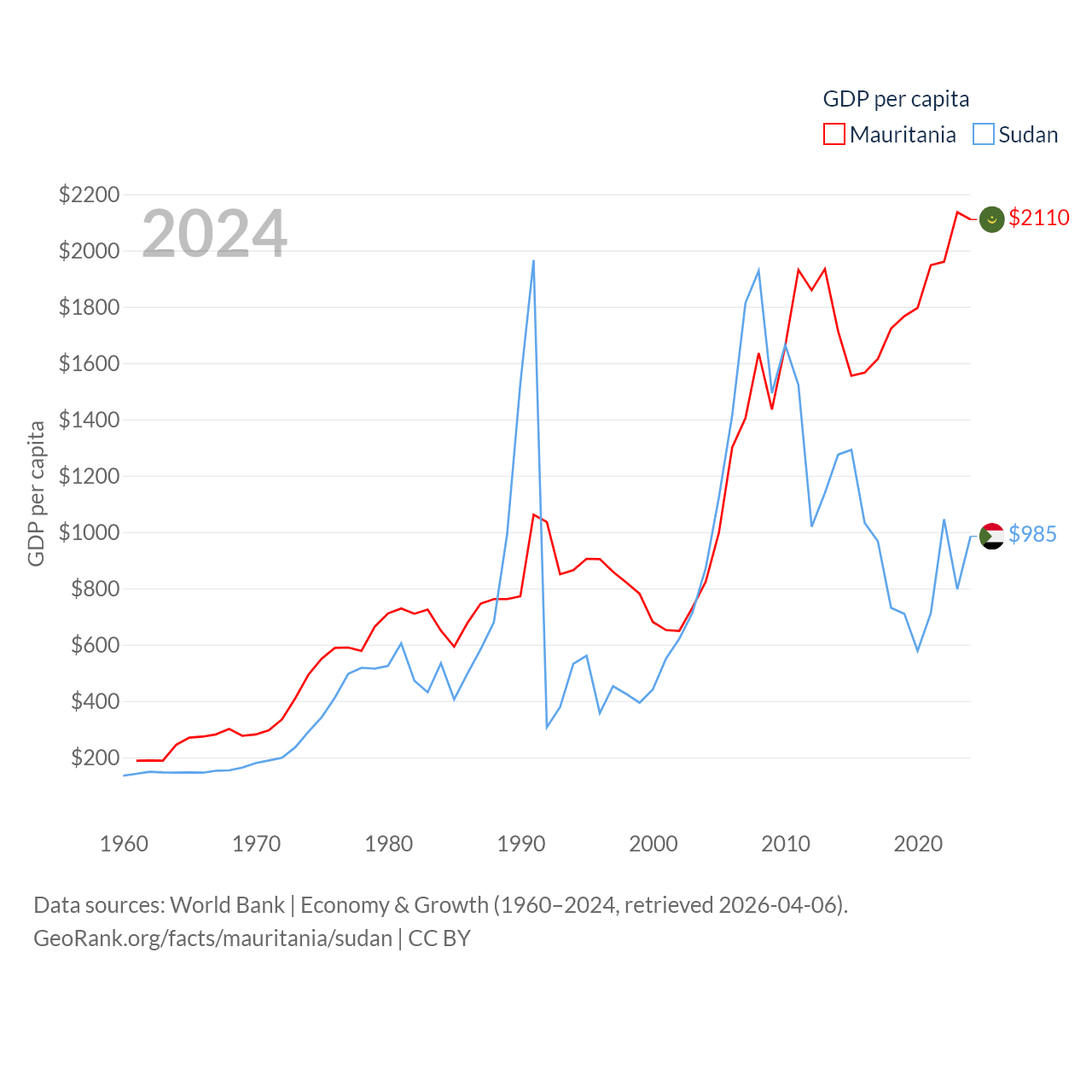 By GDP, Mauritania ranks 153/197 ($10.9B) and Sudan ranks 94/197 ($49.7B). By GDP per capita, Mauritania ranks 156/197 ($2,110), while Sudan ranks 179/197 ($985).
