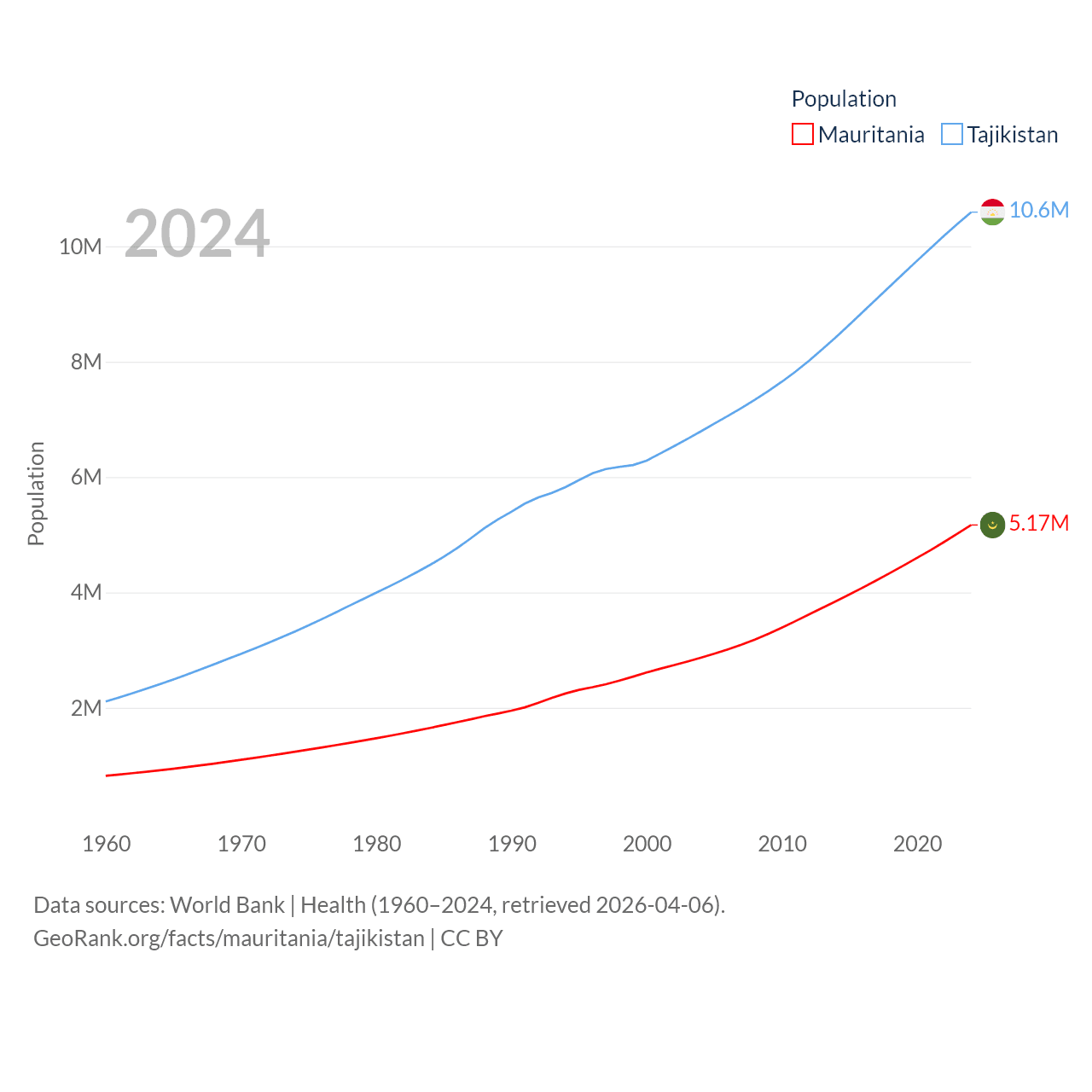 Mauritania has a population of 5.17M (ranked 125/197), compared with 10.6M in Tajikistan (ranked 91/197). Mauritania's land area is 397,955 sq mi versus 53,587 sq mi for Tajikistan (ranked 28th vs. 93rd).