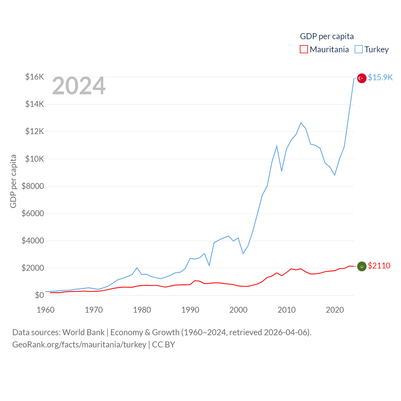 By GDP, Mauritania ranks 153/197 ($10.9B) and Turkey ranks 17/197 ($1.36T). By GDP per capita, Mauritania ranks 156/197 ($2,110), while Turkey ranks 66/197 ($15,893).