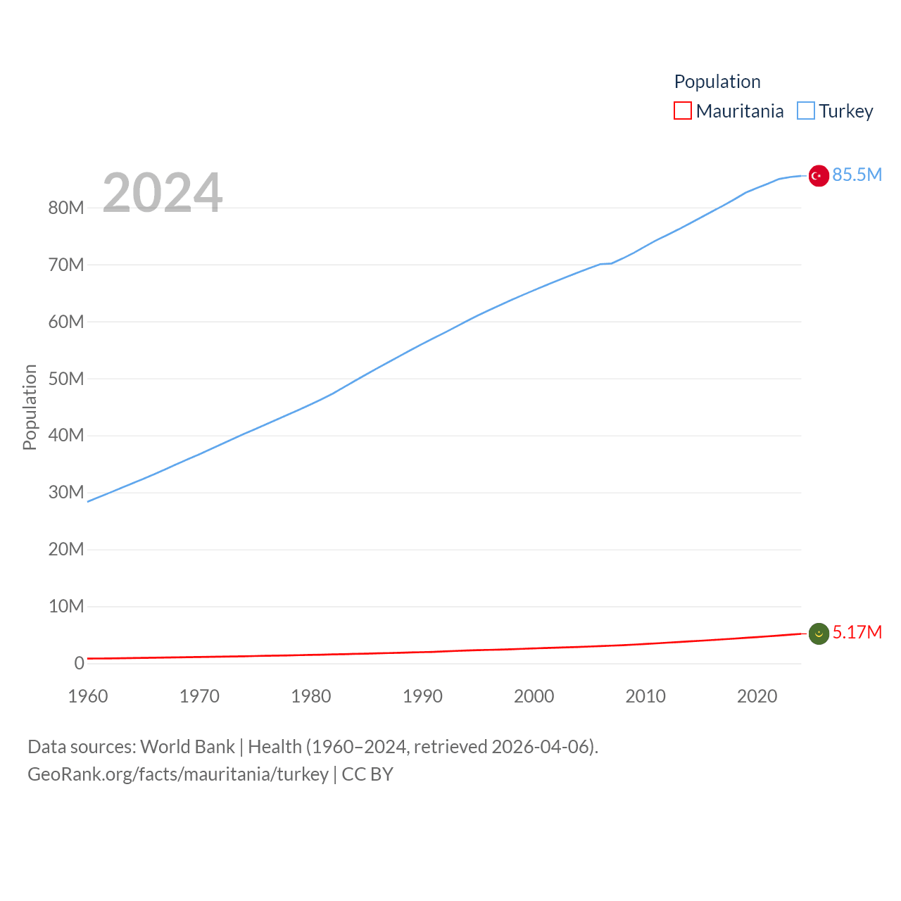 Mauritania has a population of 5.17M (ranked 125/197), compared with 85.5M in Turkey (ranked 18/197). Mauritania's land area is 397,955 sq mi versus 297,156 sq mi for Turkey (ranked 28th vs. 36th).