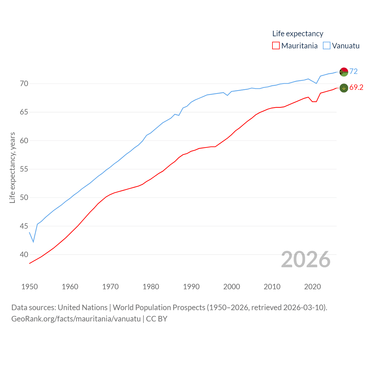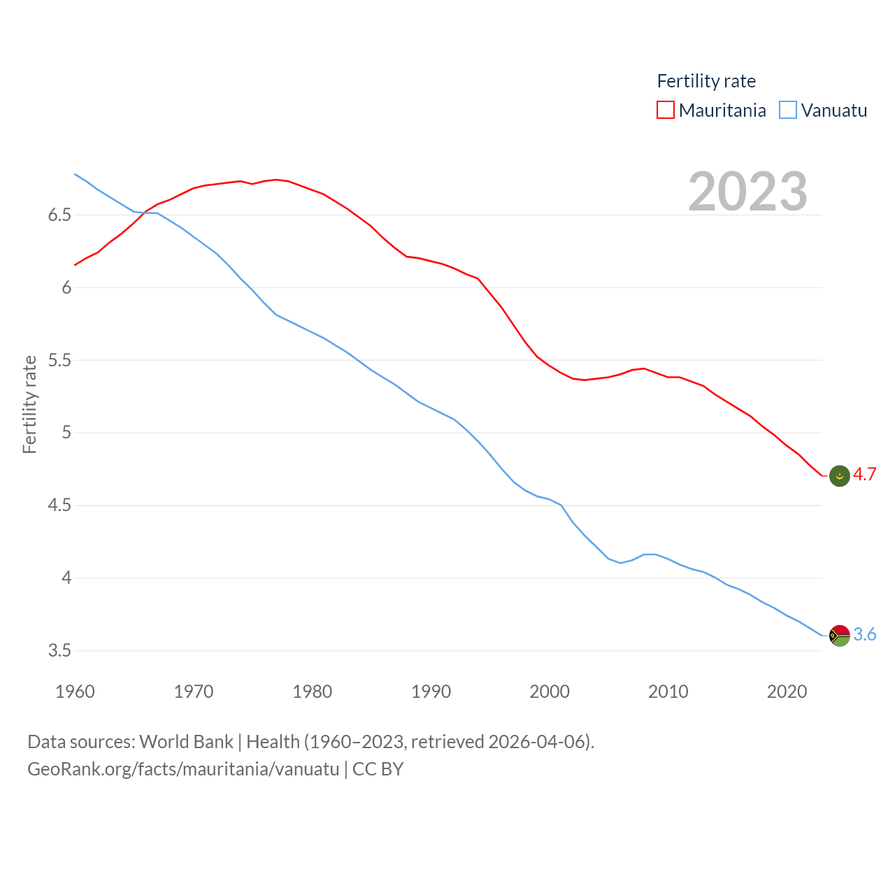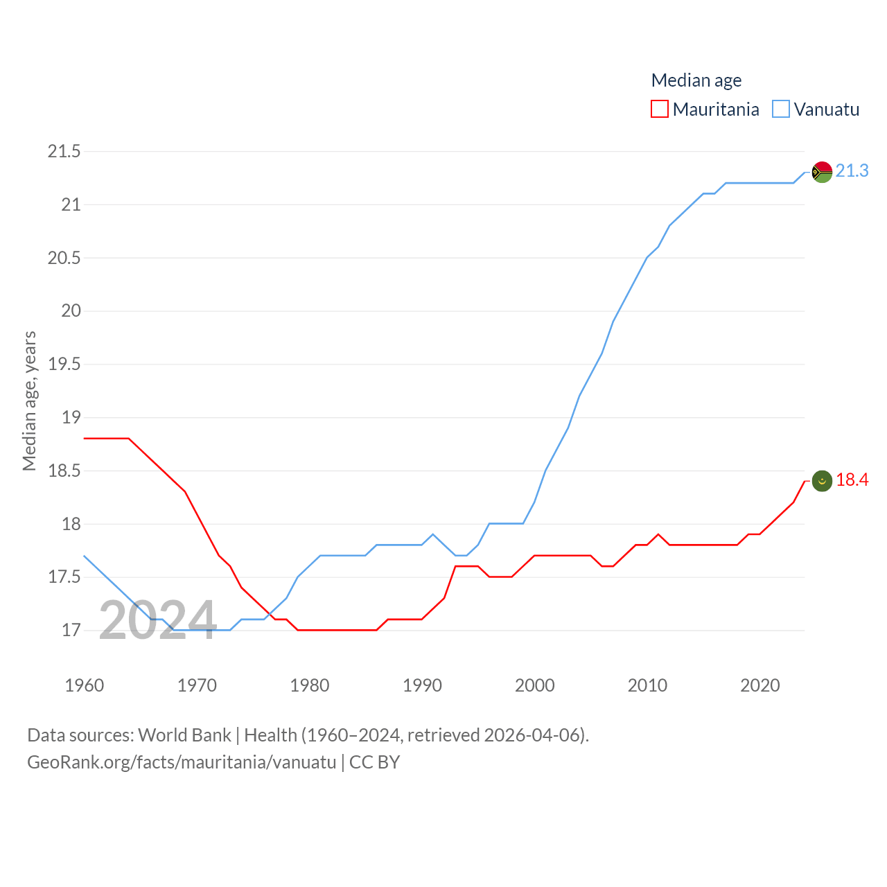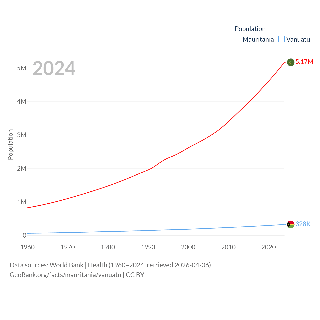 Mauritania has a population of 5.17M (ranked 125/197), compared with 328K in Vanuatu (ranked 174/197). Mauritania's land area is 397,955 sq mi versus 4,707 sq mi for Vanuatu (ranked 28th vs. 157th).