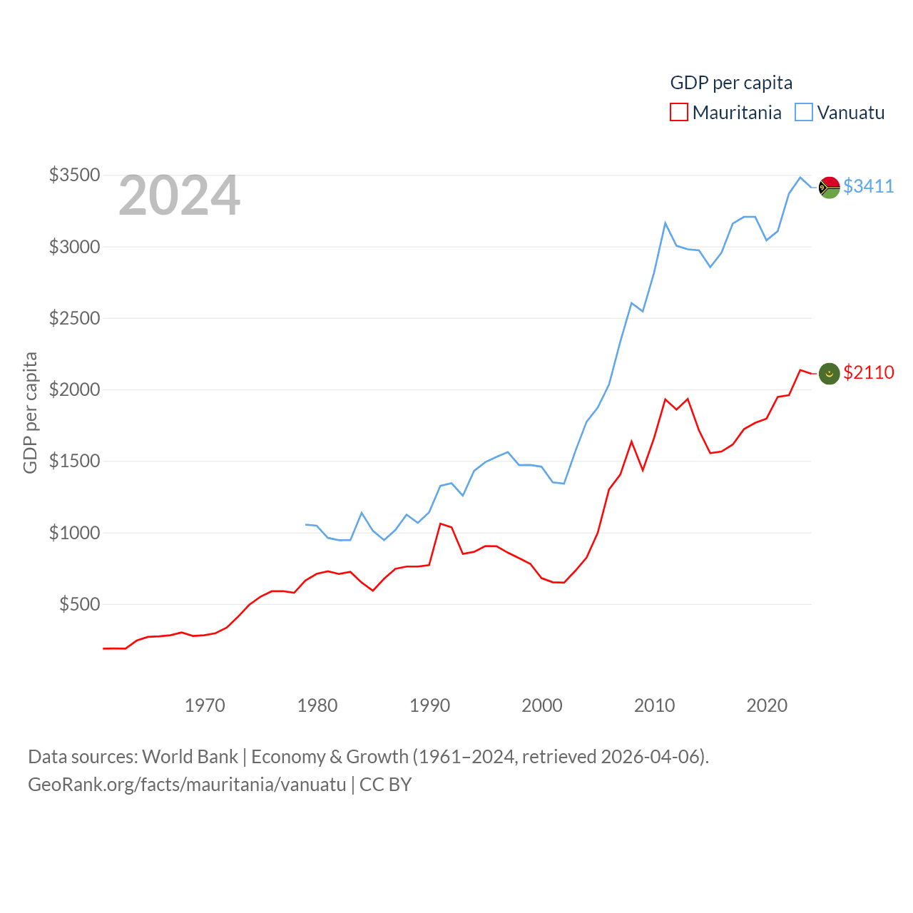 By GDP, Mauritania ranks 153/197 ($10.9B) and Vanuatu ranks 188/197 ($1.12B). By GDP per capita, Mauritania ranks 156/197 ($2,110), while Vanuatu ranks 137/197 ($3,411).