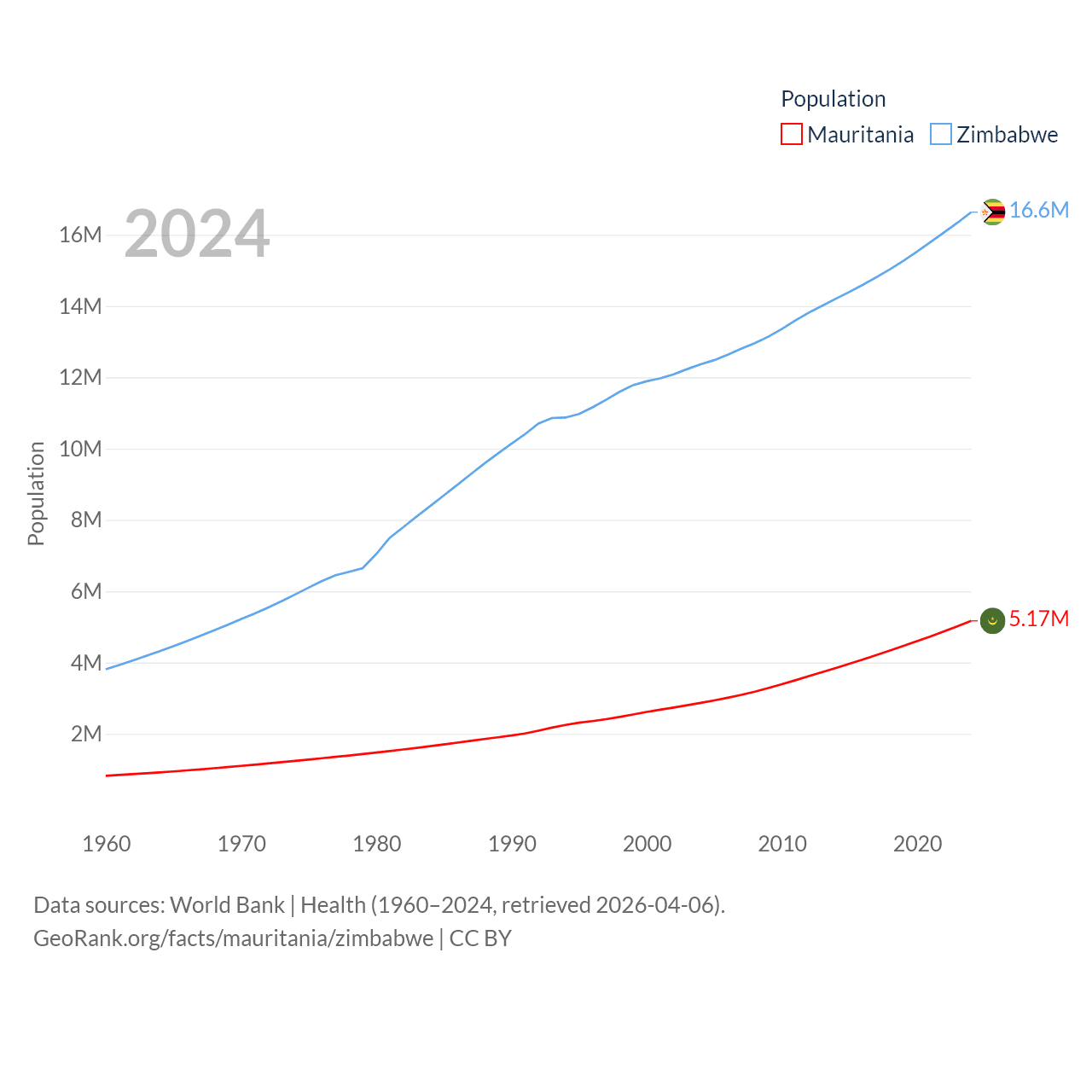 Mauritania has a population of 5.17M (ranked 125/197), compared with 16.6M in Zimbabwe (ranked 74/197). Mauritania's land area is 397,955 sq mi versus 149,364 sq mi for Zimbabwe (ranked 28th vs. 60th).