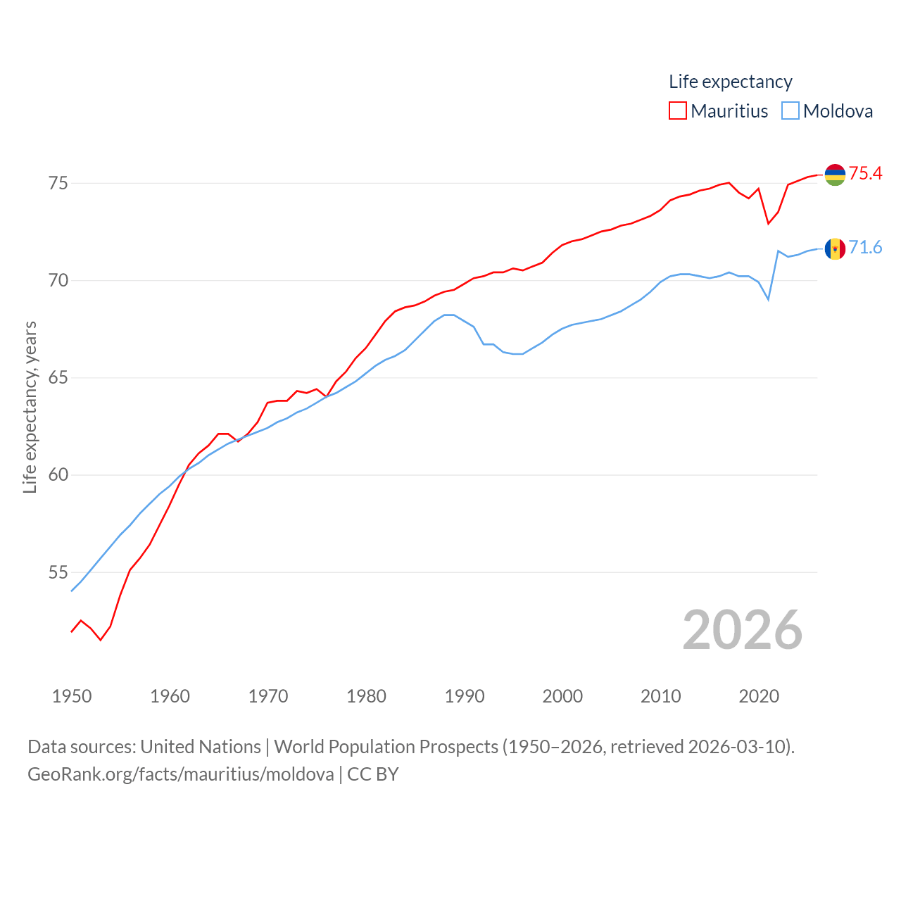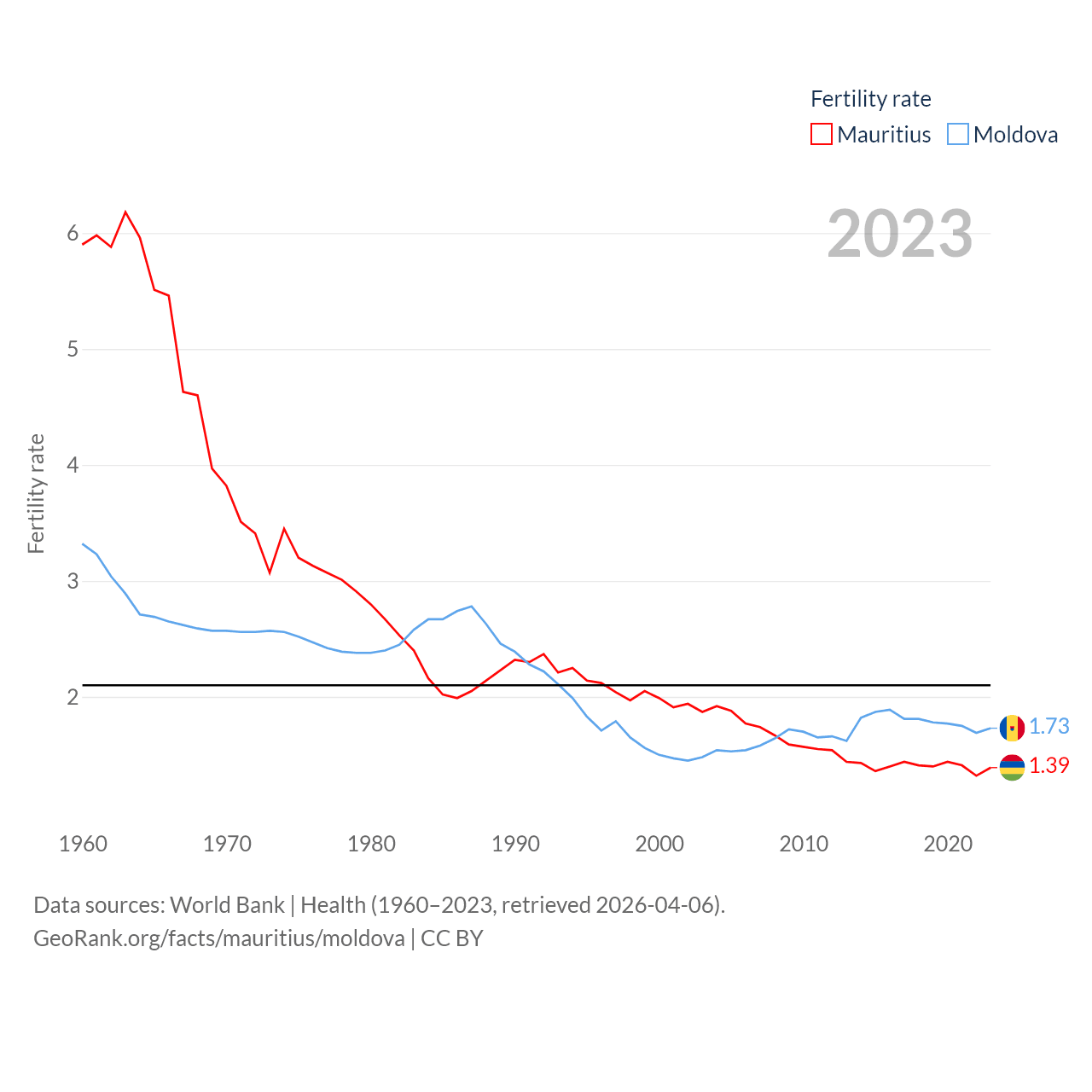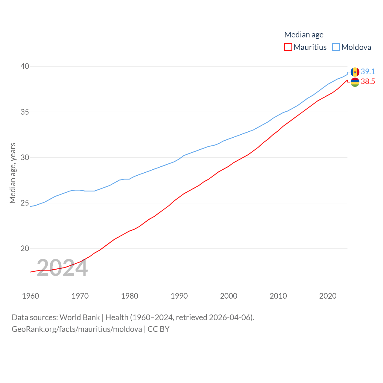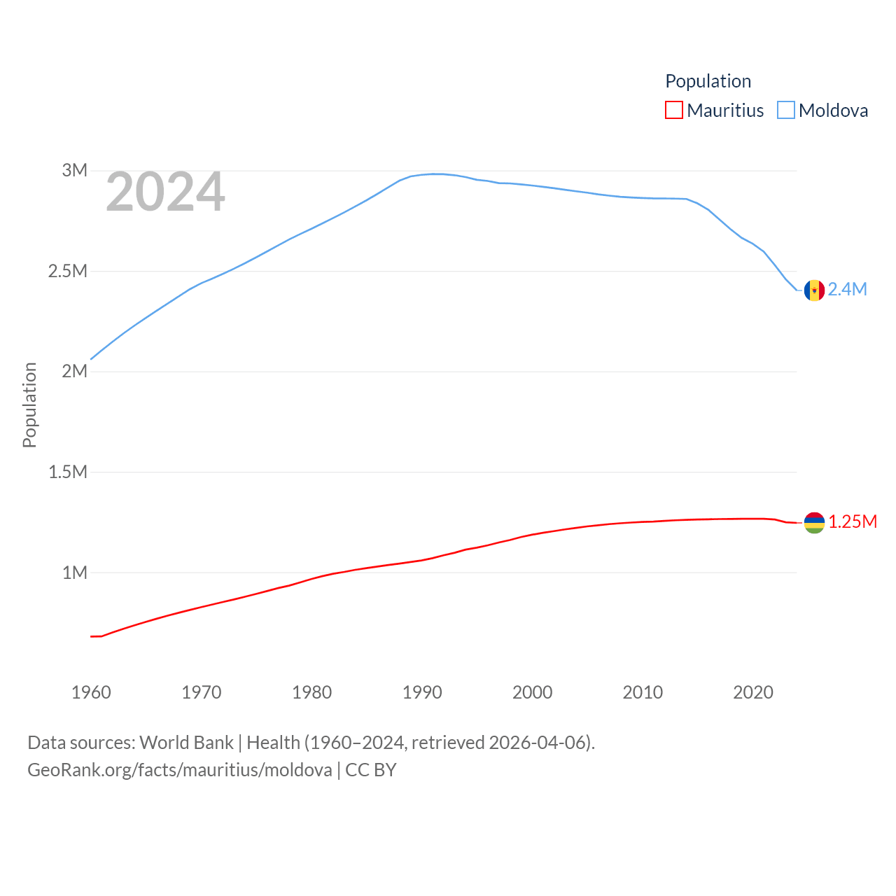 Mauritius has a population of 1.25M (ranked 156/197), compared with 2.4M in Moldova (ranked 143/197). Mauritius' land area is 771 sq mi versus 12,714 sq mi for Moldova (ranked 170th vs. 135th).