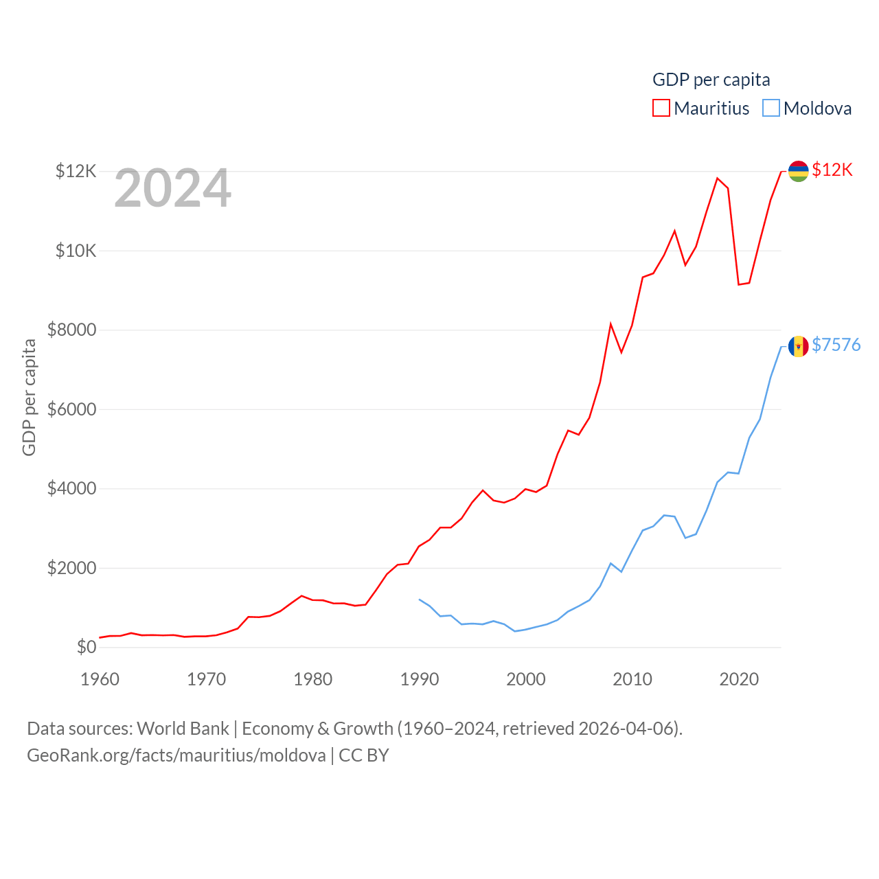By GDP, Mauritius ranks 143/197 ($14.9B) and Moldova ranks 134/197 ($18.2B). By GDP per capita, Mauritius ranks 78/197 ($11,991), while Moldova ranks 99/197 ($7,576).
