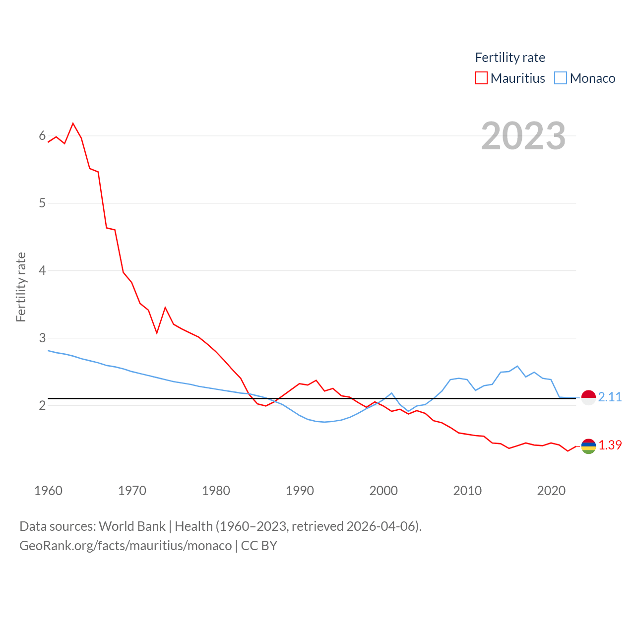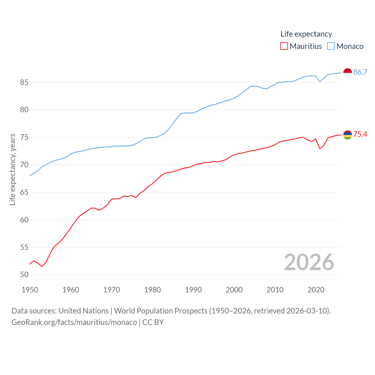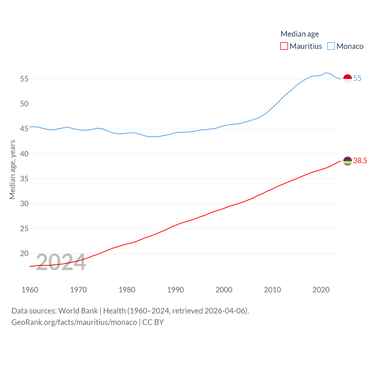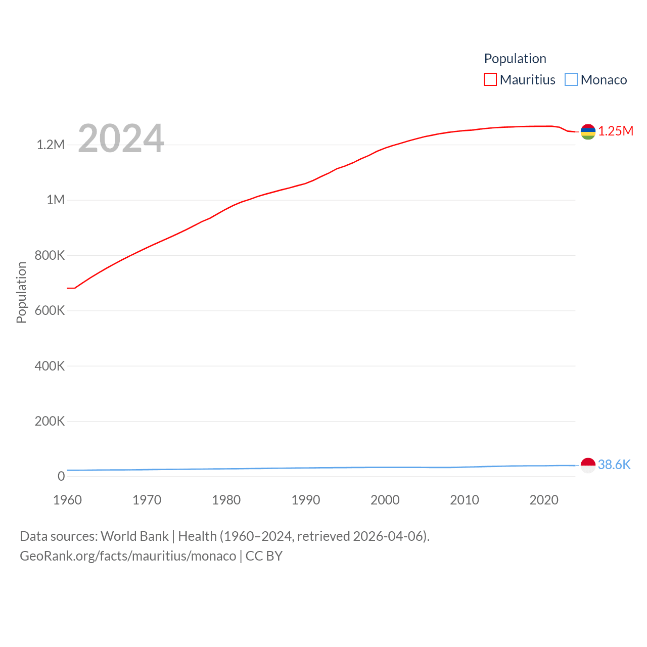 Mauritius has a population of 1.25M (ranked 156/197), compared with 38.6K in Monaco (ranked 191/197). Mauritius' land area is 771 sq mi versus 0.8 sq mi for Monaco (ranked 170th vs. 196th).