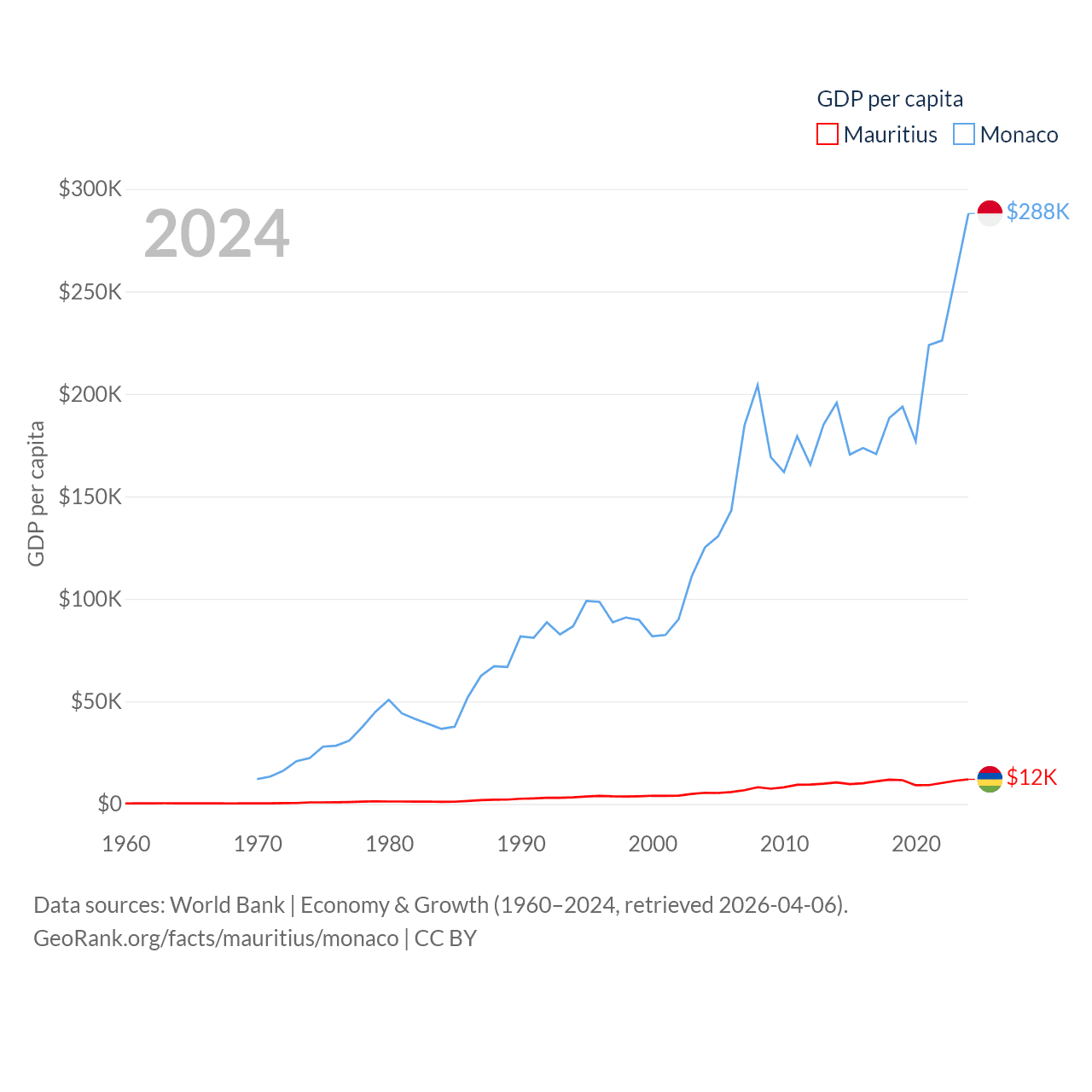By GDP, Mauritius ranks 143/197 ($14.9B) and Monaco ranks 152/197 ($11.1B). By GDP per capita, Mauritius ranks 78/197 ($11,991), while Monaco ranks 1/197 ($288,001).