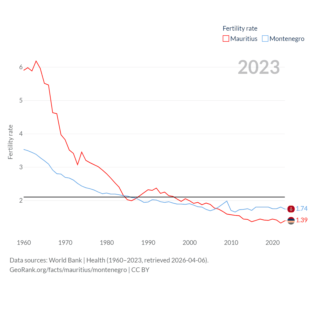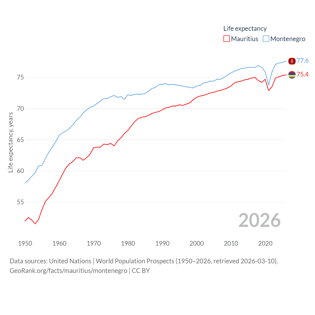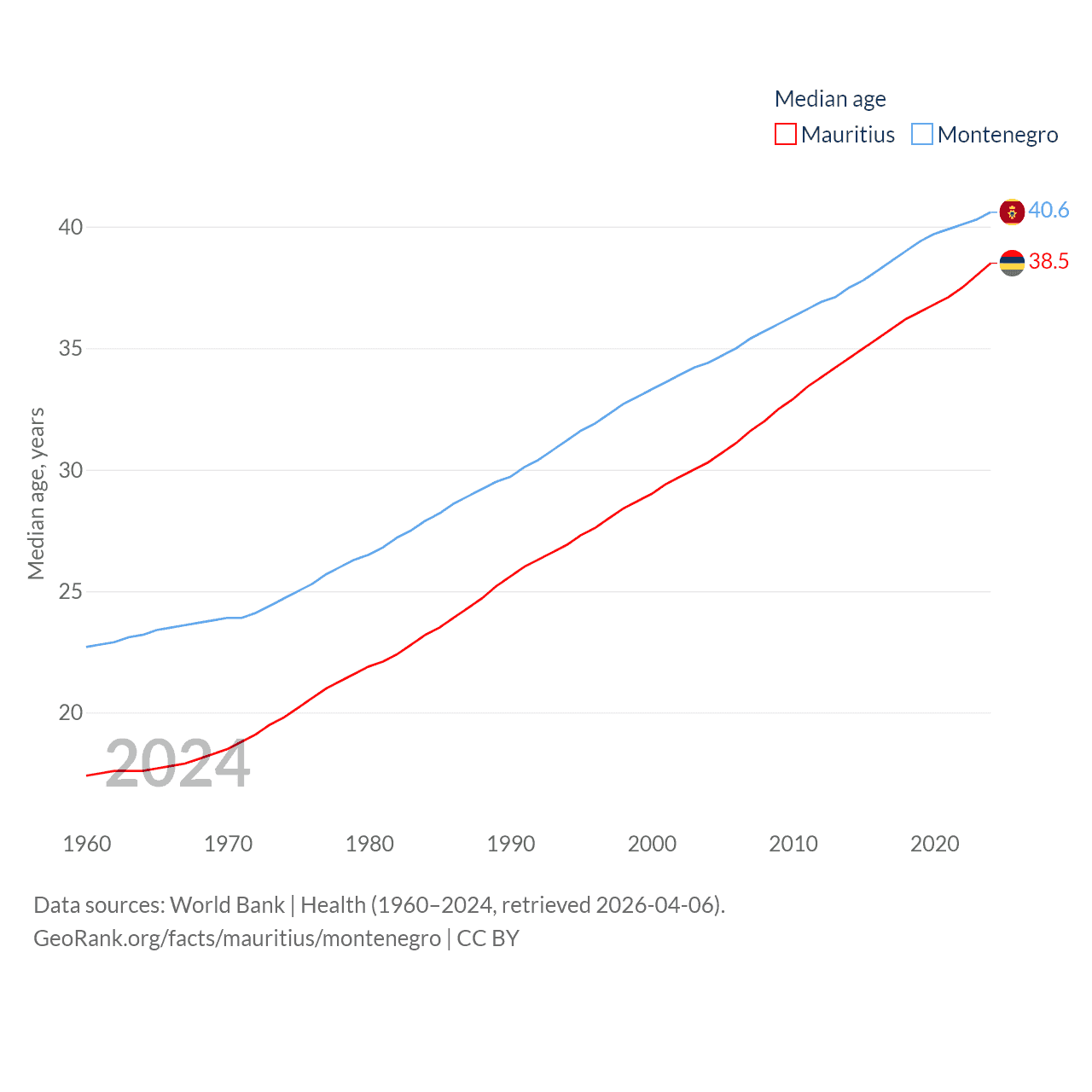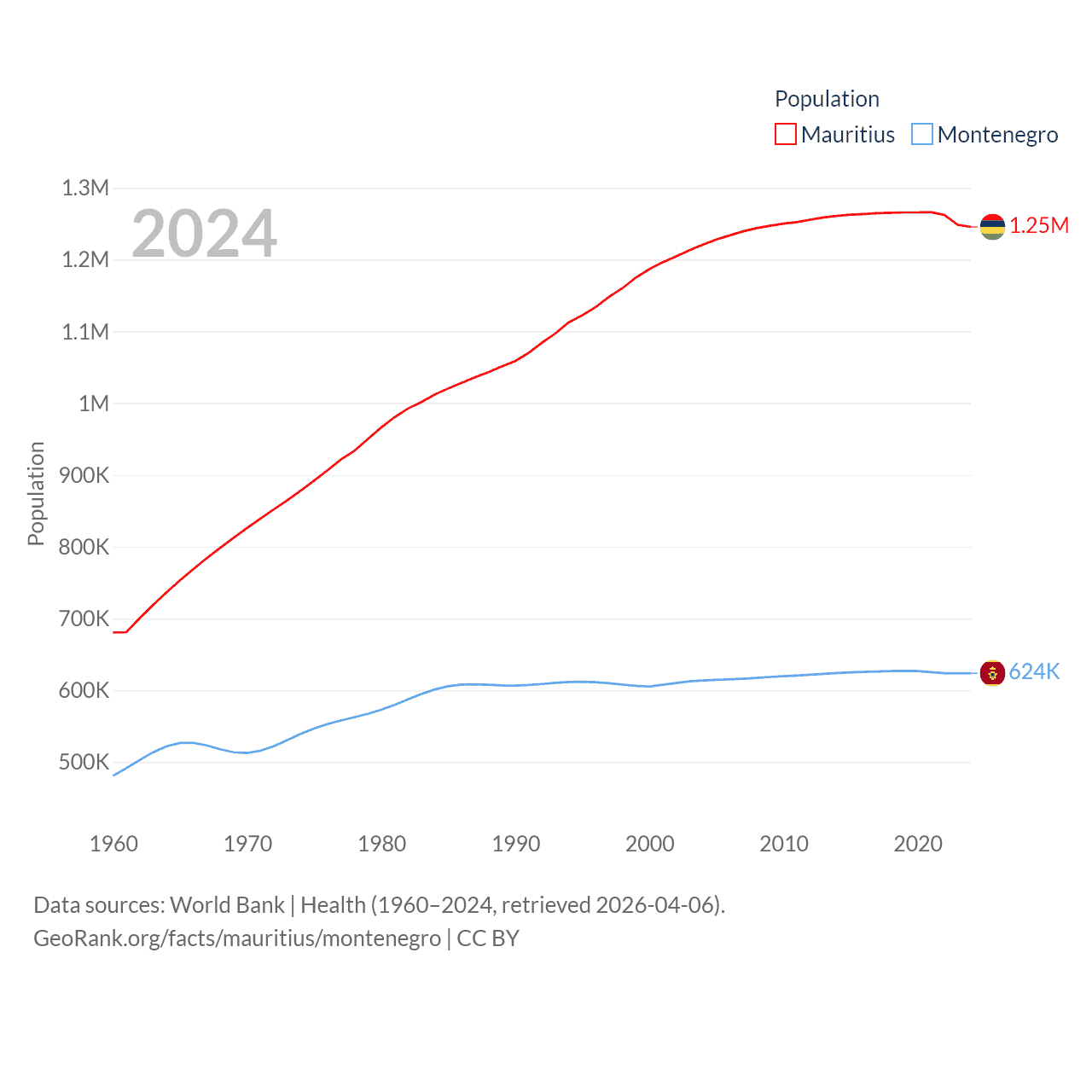 Mauritius has a population of 1.25M (ranked 156/197), compared with 624K in Montenegro (ranked 166/197). Mauritius' land area is 771 sq mi versus 5,193 sq mi for Montenegro (ranked 170th vs. 156th).