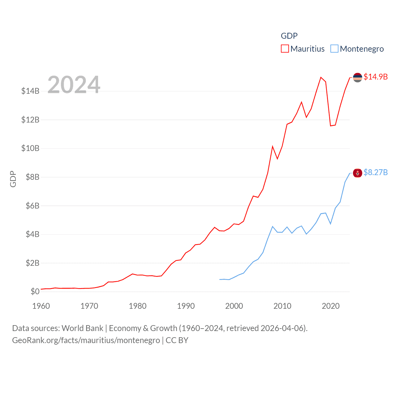 By GDP, Mauritius ranks 143/197 ($14.9B) and Montenegro ranks 155/197 ($8.27B). By GDP per capita, Mauritius ranks 78/197 ($11,991), while Montenegro ranks 77/197 ($13,263).