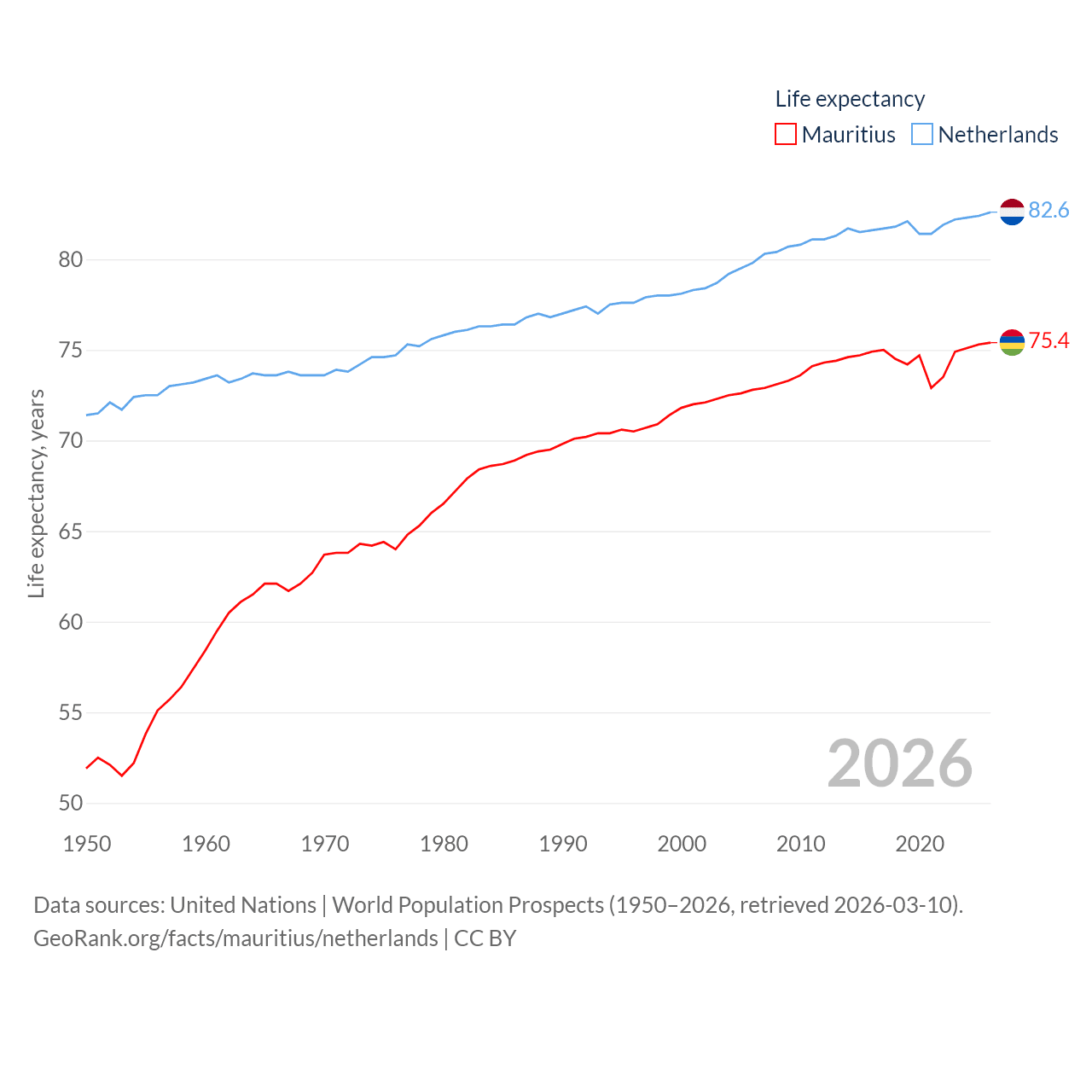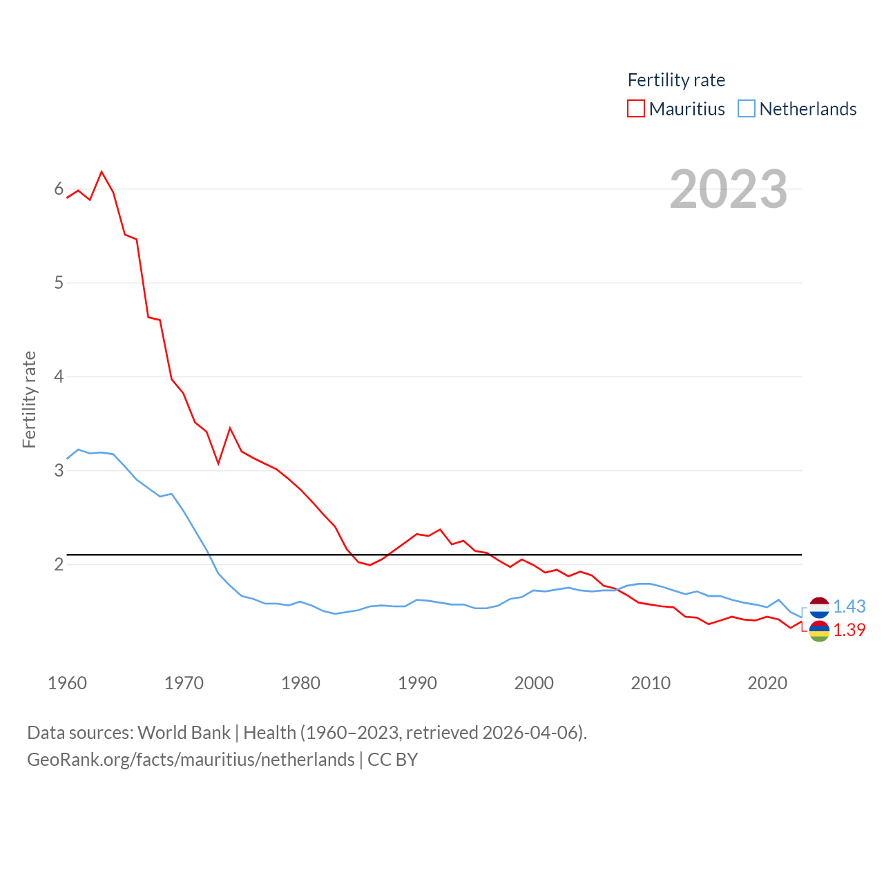Mauritius has a population of 1.25M (ranked 156/197), compared with 18M in The Netherlands (ranked 72/197). Mauritius' land area is 771 sq mi versus 13,000 sq mi for The Netherlands (ranked 170th vs. 134th).