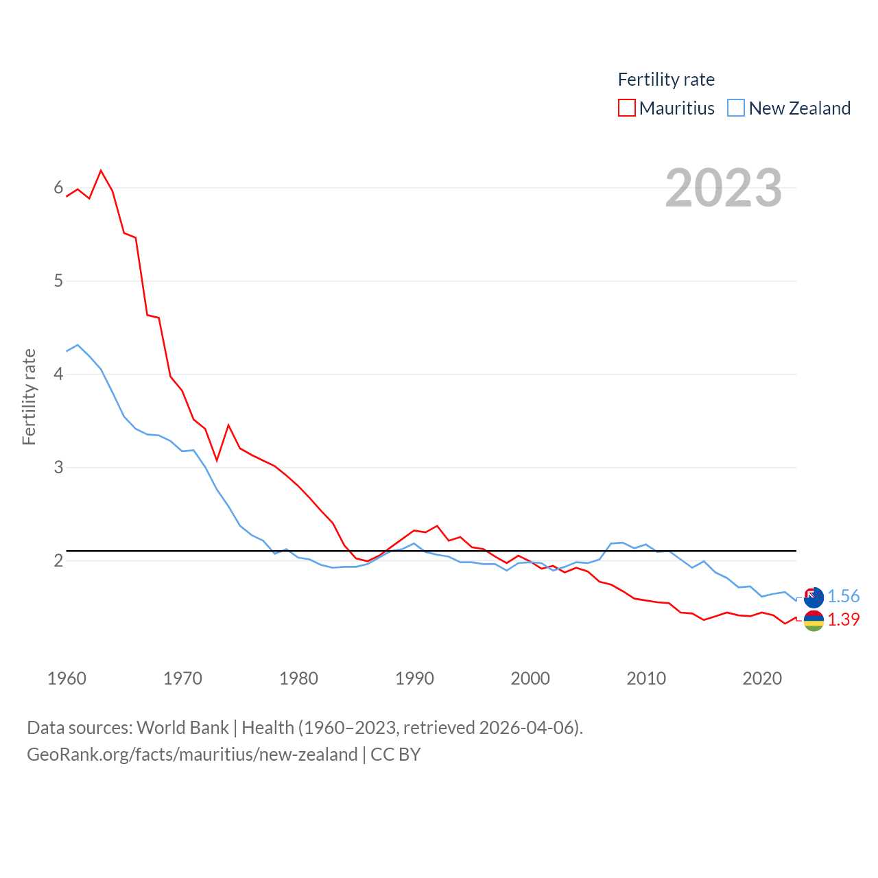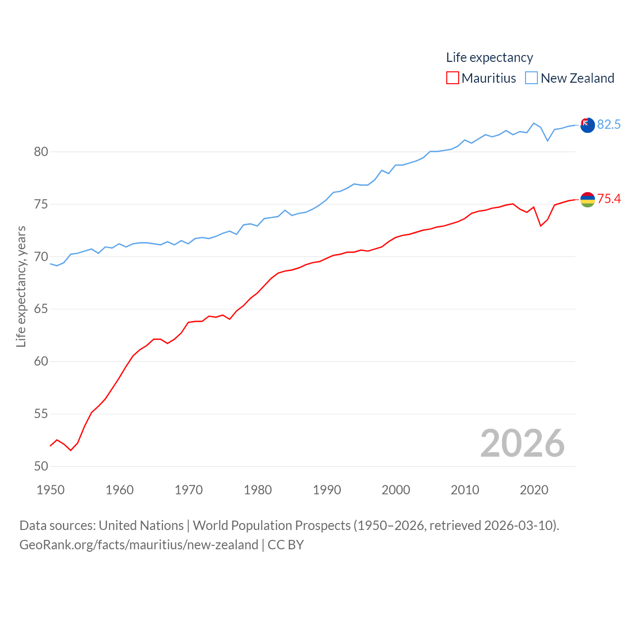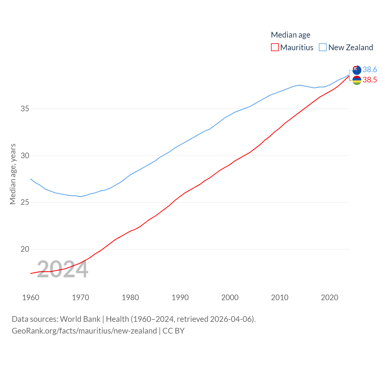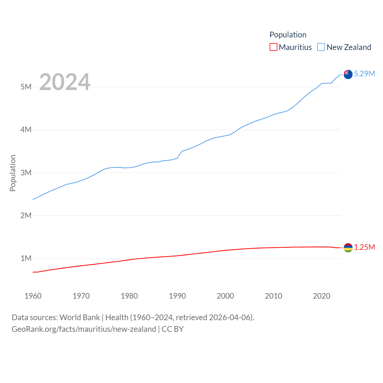 Mauritius has a population of 1.25M (ranked 156/197), compared with 5.29M in New Zealand (ranked 123/197). Mauritius' land area is 771 sq mi versus 101,665 sq mi for New Zealand (ranked 170th vs. 74th).