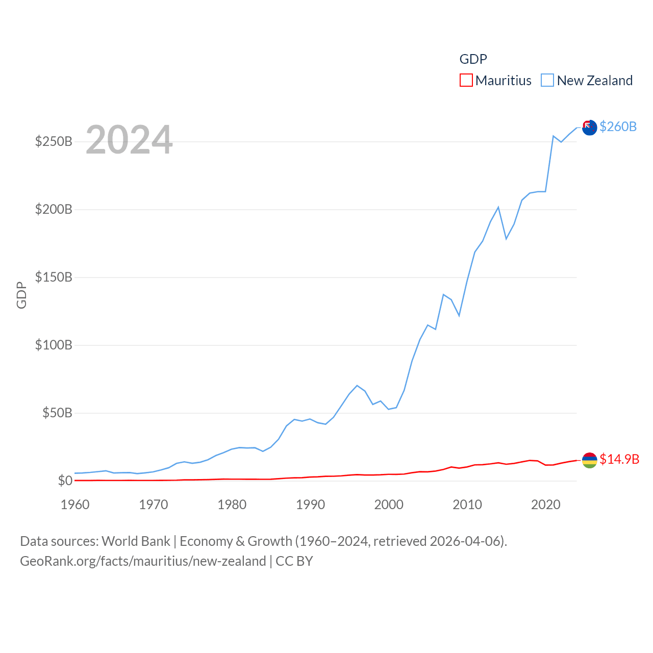 By GDP, Mauritius ranks 143/197 ($14.9B) and New Zealand ranks 52/197 ($260B). By GDP per capita, Mauritius ranks 78/197 ($11,991), while New Zealand ranks 26/197 ($49,205).