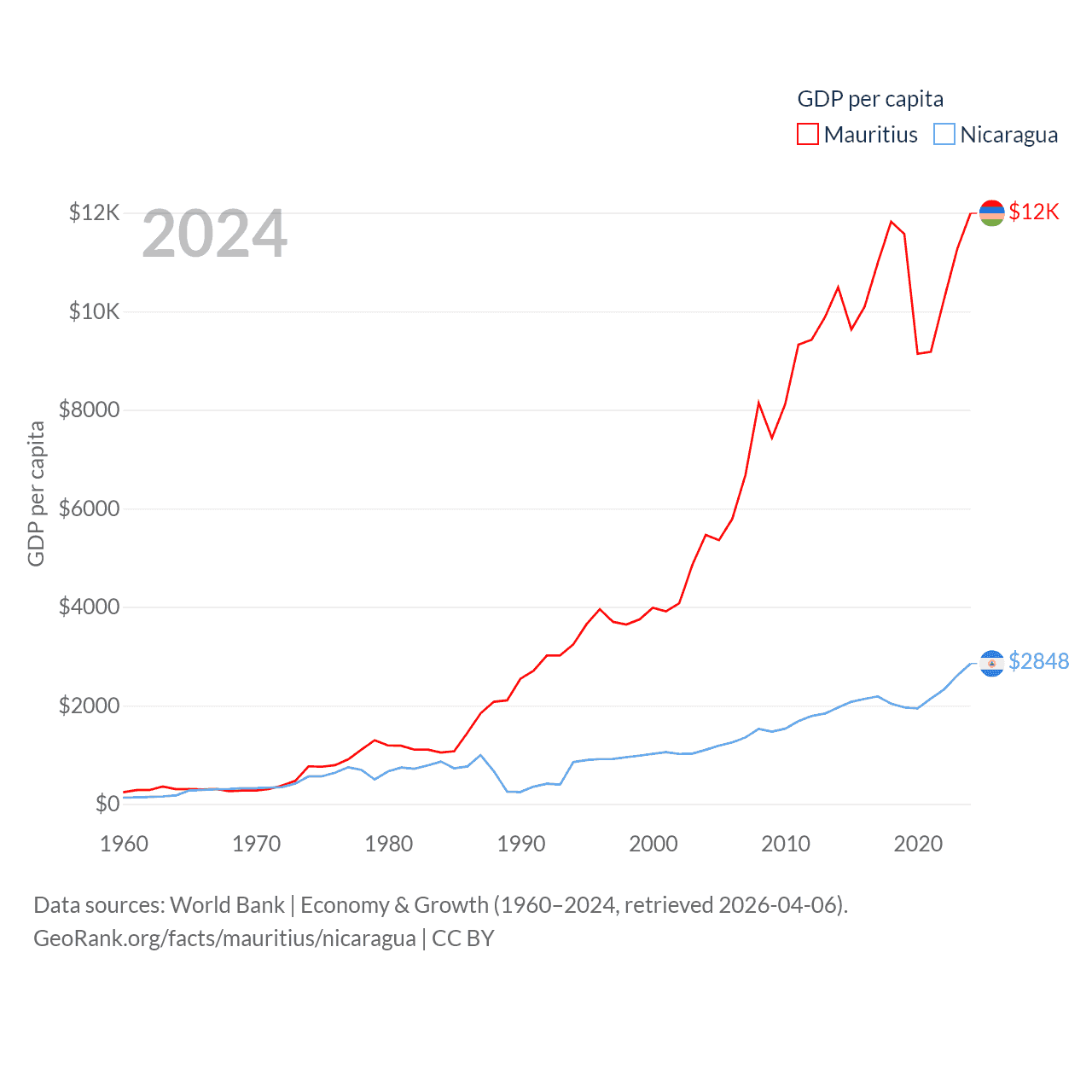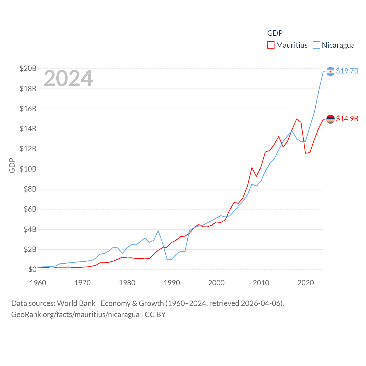 By GDP, Mauritius ranks 143/197 ($14.9B) and Nicaragua ranks 131/197 ($19.7B). By GDP per capita, Mauritius ranks 78/197 ($11,991), while Nicaragua ranks 141/197 ($2,848).