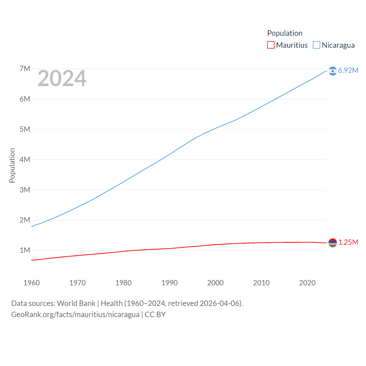 Mauritius has a population of 1.25M (ranked 156/197), compared with 6.92M in Nicaragua (ranked 108/197). Mauritius' land area is 771 sq mi versus 46,464 sq mi for Nicaragua (ranked 170th vs. 98th).