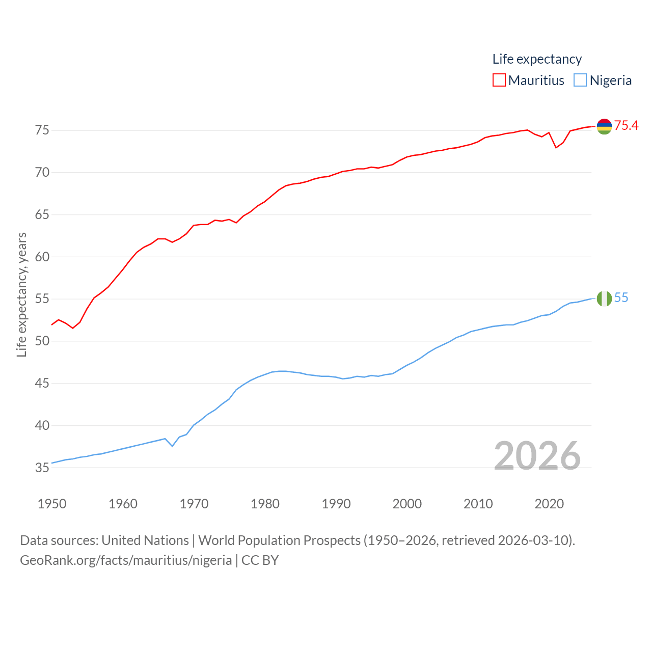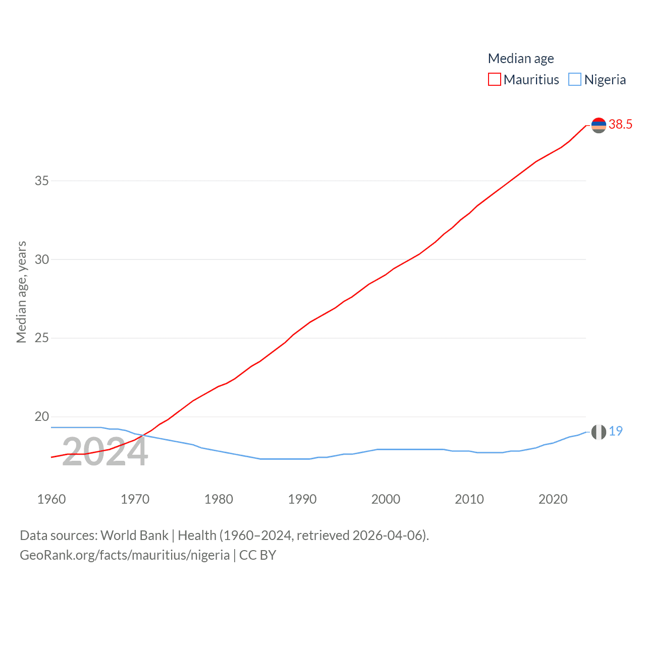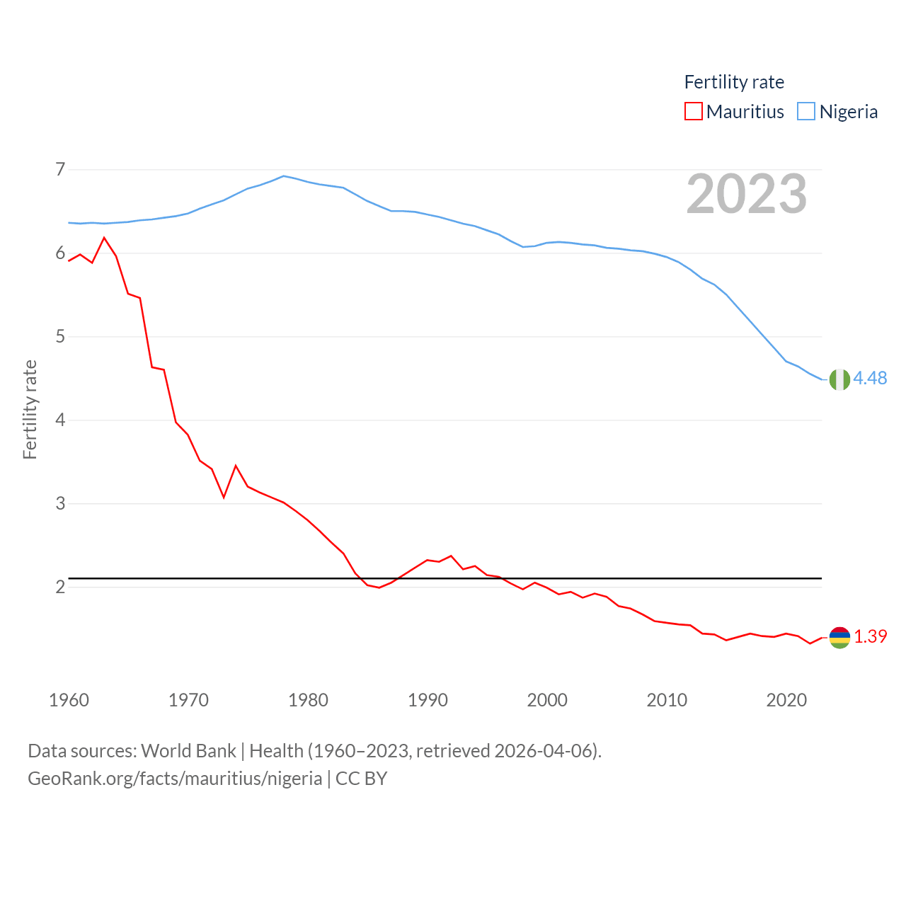 Mauritius has a population of 1.25M (ranked 156/197), compared with 233M in Nigeria (ranked 6/197). Mauritius' land area is 771 sq mi versus 351,650 sq mi for Nigeria (ranked 170th vs. 30th).