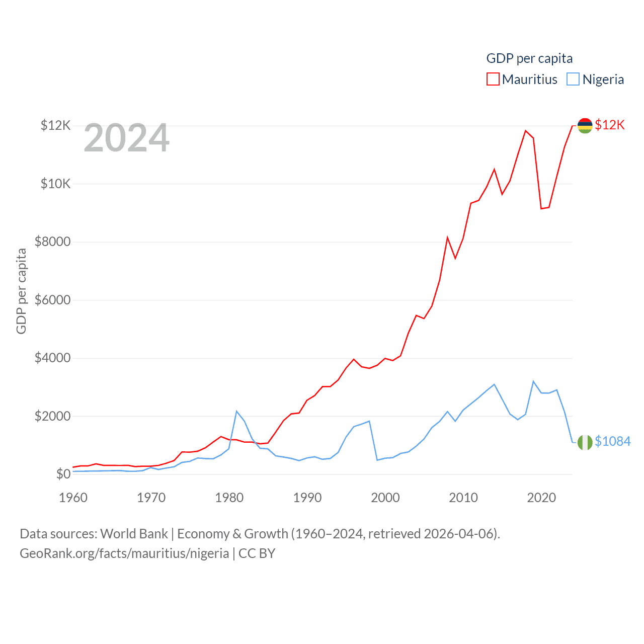 By GDP, Mauritius ranks 143/197 ($14.9B) and Nigeria ranks 54/197 ($252B). By GDP per capita, Mauritius ranks 78/197 ($11,991), while Nigeria ranks 174/197 ($1,084).