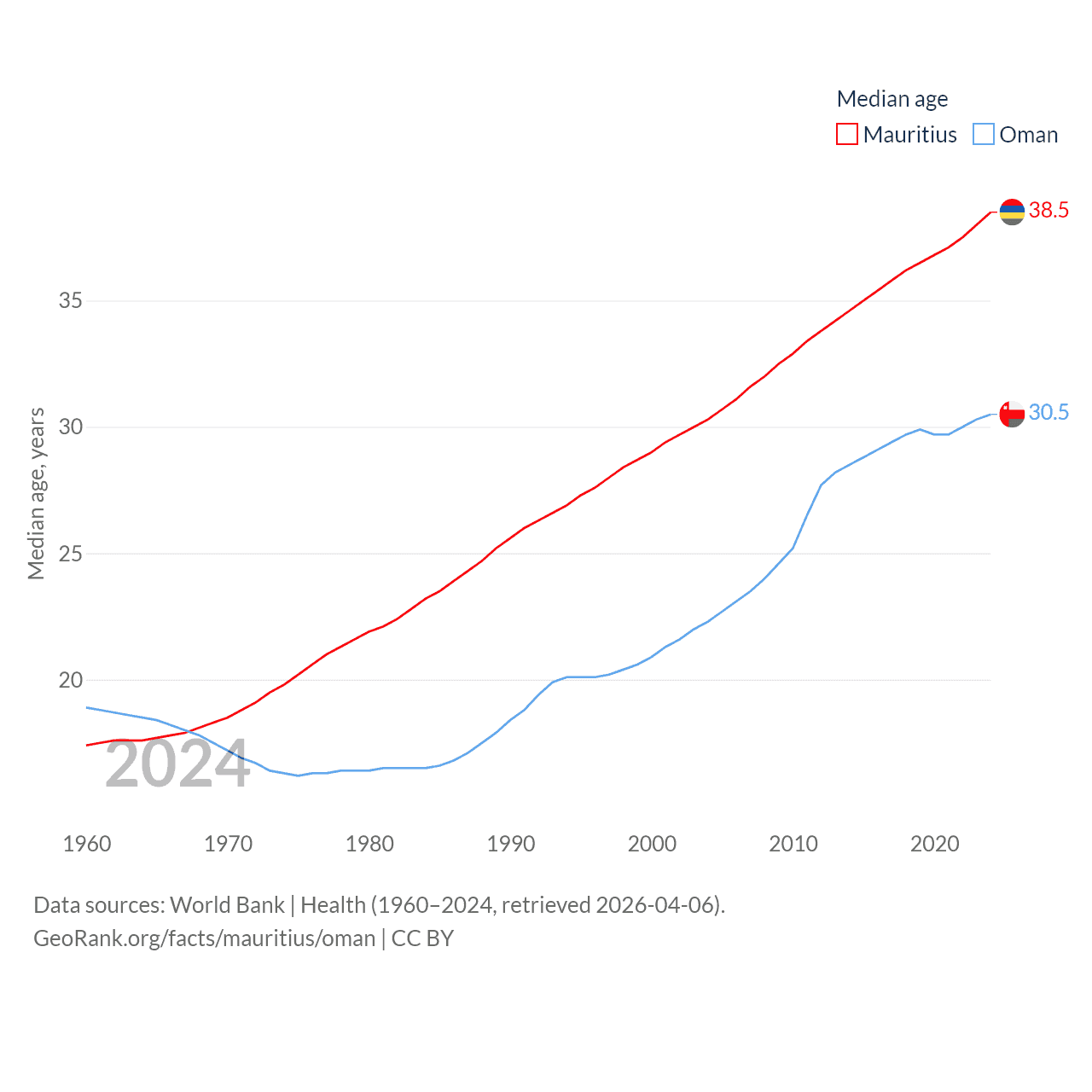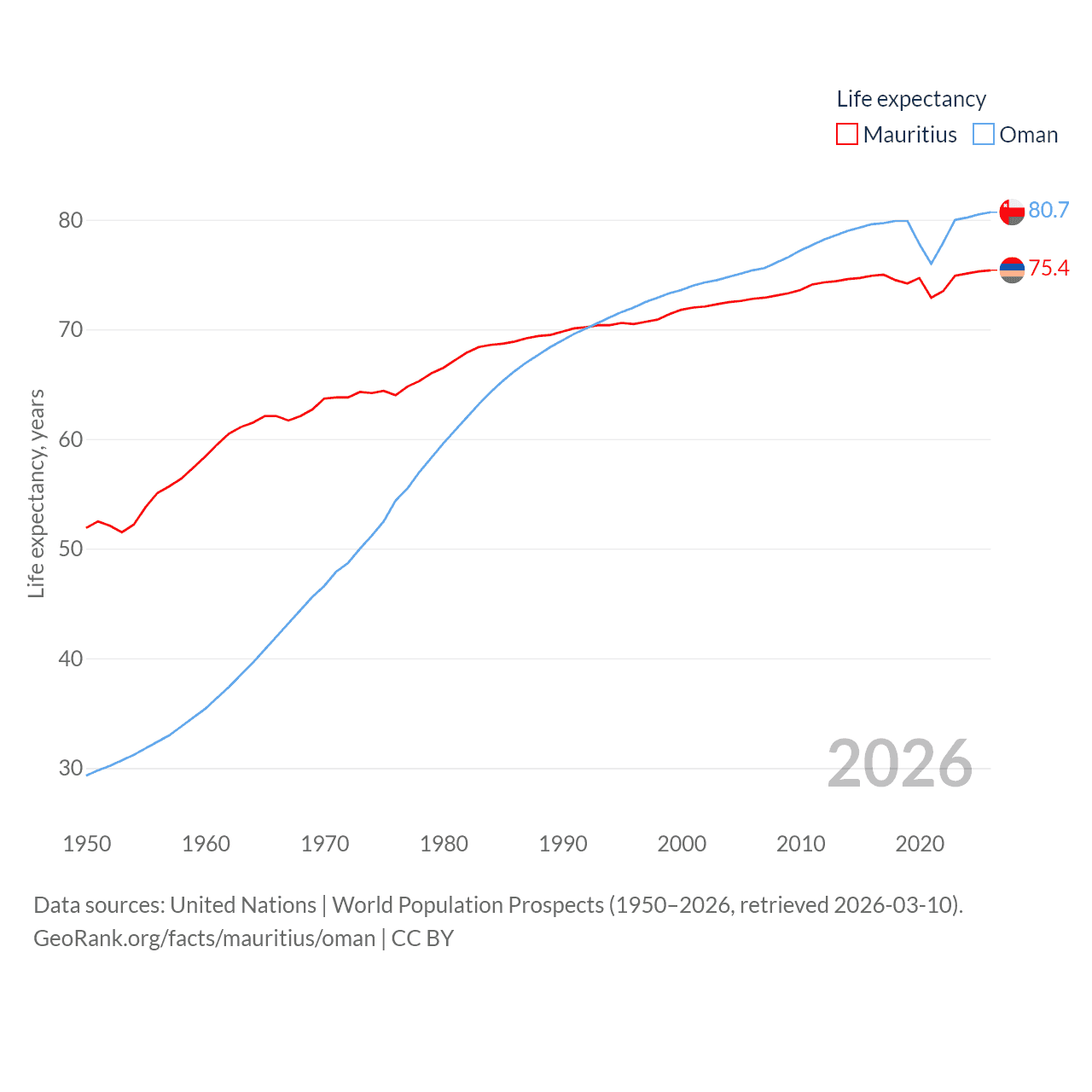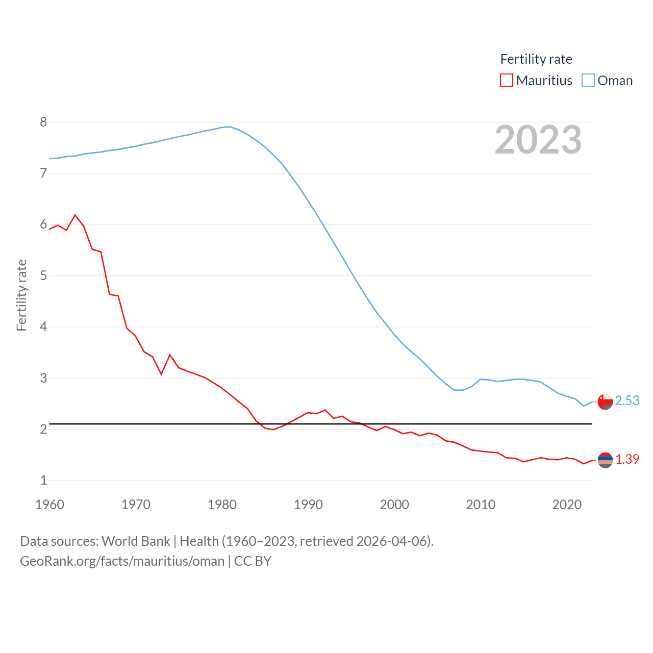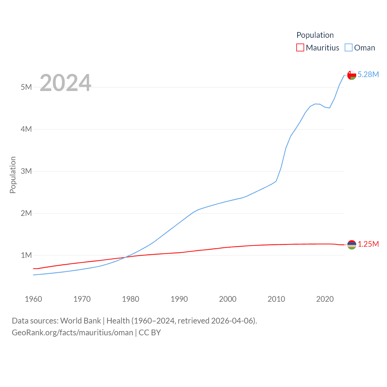 Mauritius has a population of 1.25M (ranked 156/197), compared with 5.28M in Oman (ranked 124/197). Mauritius' land area is 771 sq mi versus 119,499 sq mi for Oman (ranked 170th vs. 68th).
