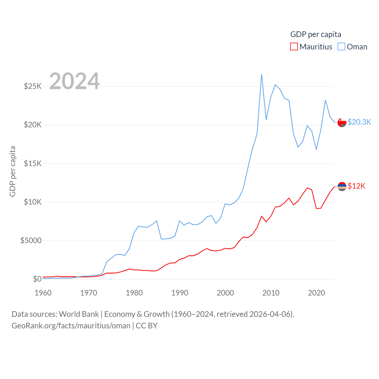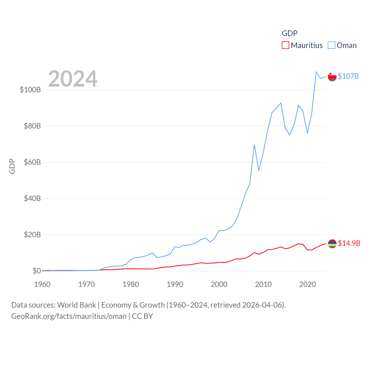 By GDP, Mauritius ranks 143/197 ($14.9B) and Oman ranks 70/197 ($107B). By GDP per capita, Mauritius ranks 78/197 ($11,991), while Oman ranks 57/197 ($20,285).