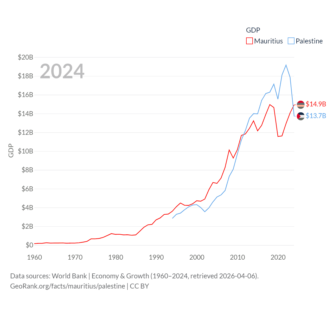 By GDP, Mauritius ranks 143/197 ($14.9B) and Palestine ranks 146/197 ($13.7B). By GDP per capita, Mauritius ranks 78/197 ($11,991), while Palestine ranks 147/197 ($2,592).