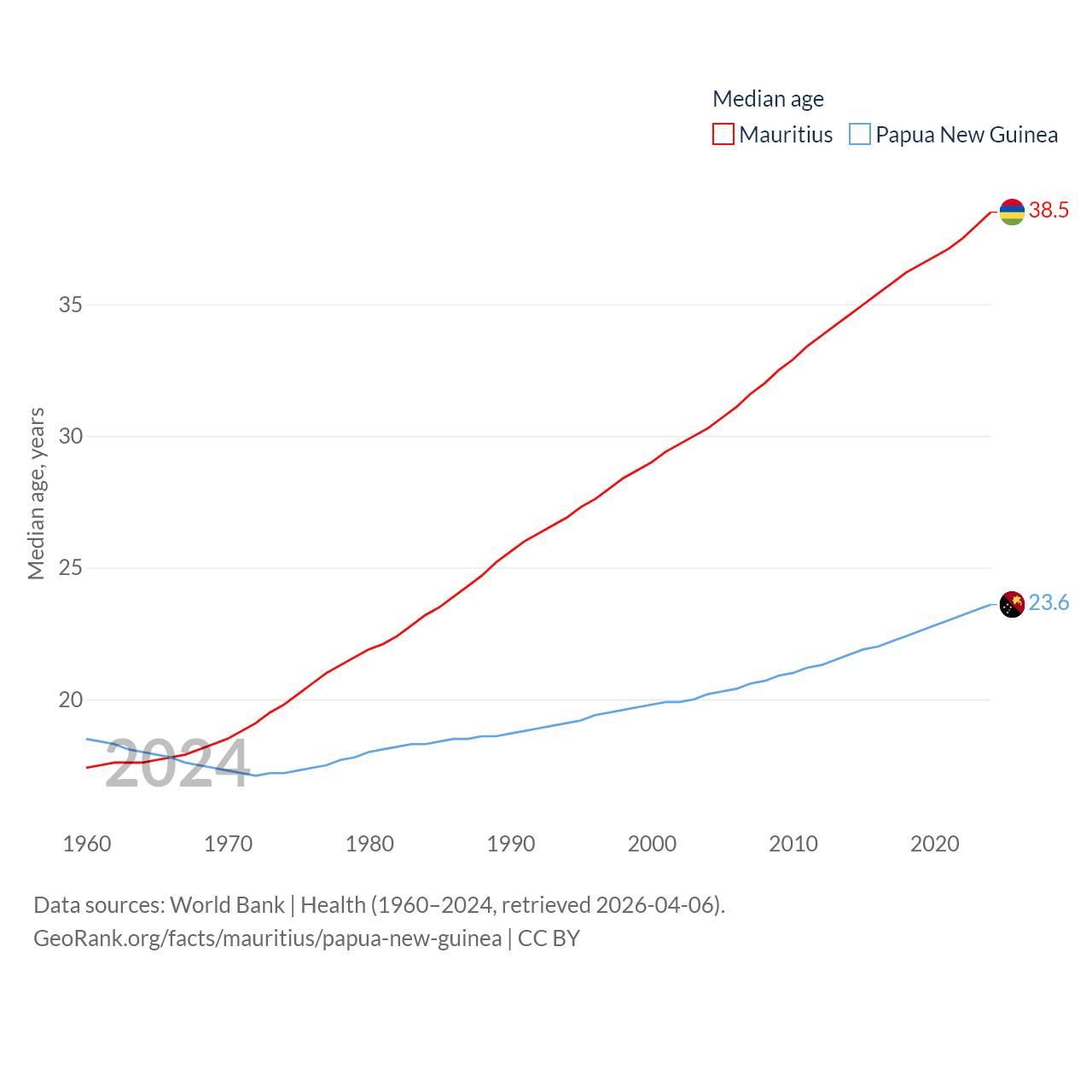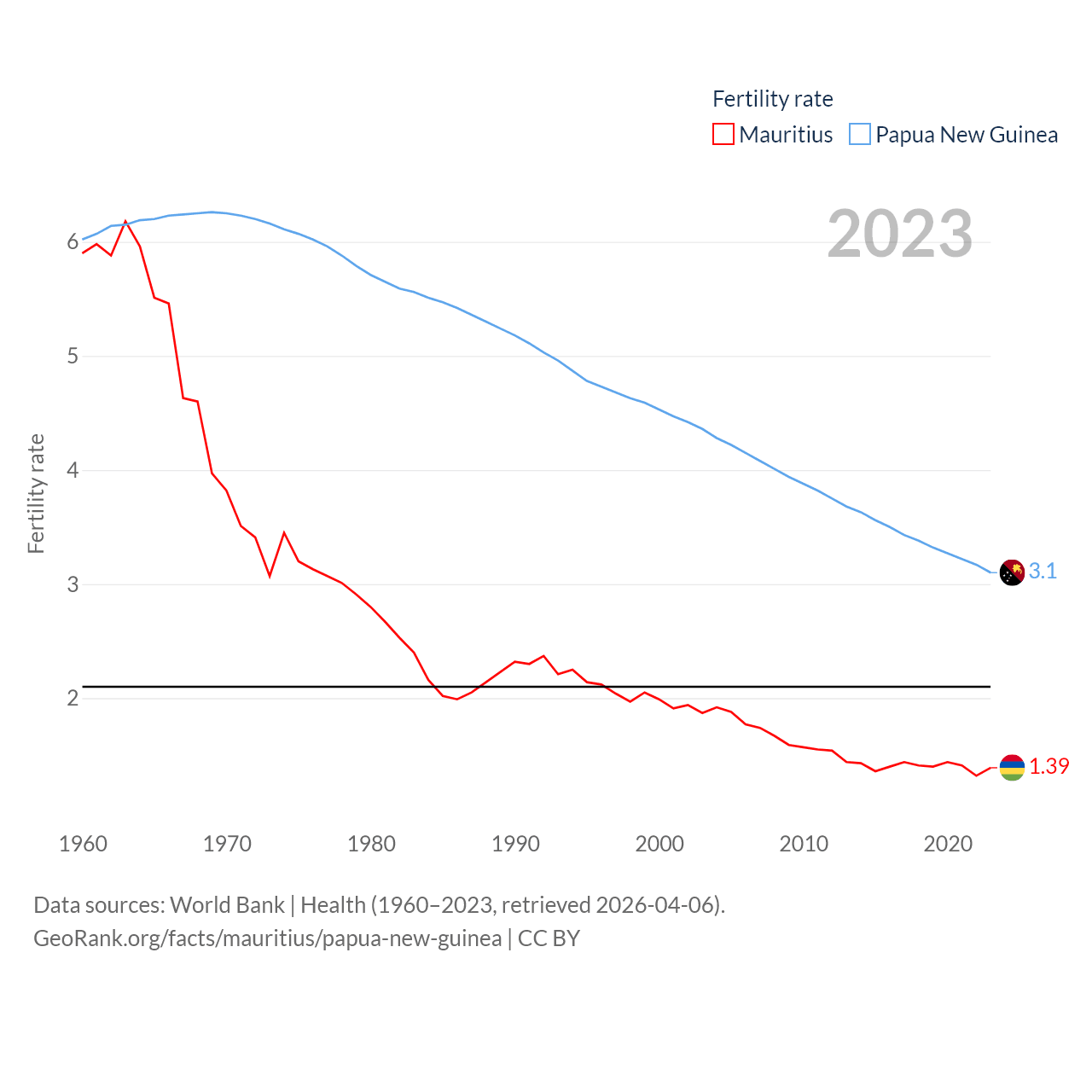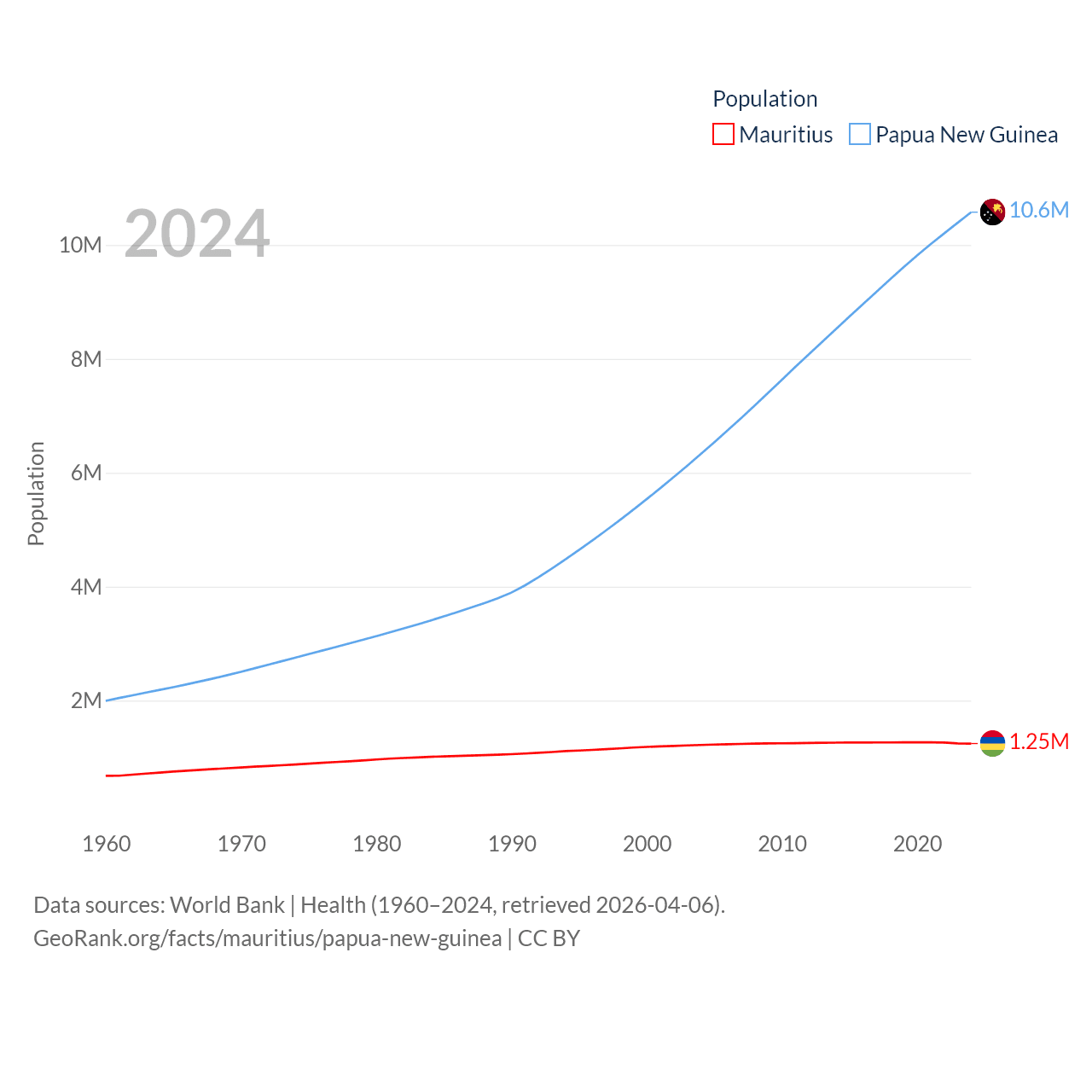 Mauritius has a population of 1.25M (ranked 156/197), compared with 10.6M in Papua New Guinea (ranked 92/197). Mauritius' land area is 771 sq mi versus 174,850 sq mi for Papua New Guinea (ranked 170th vs. 54th).