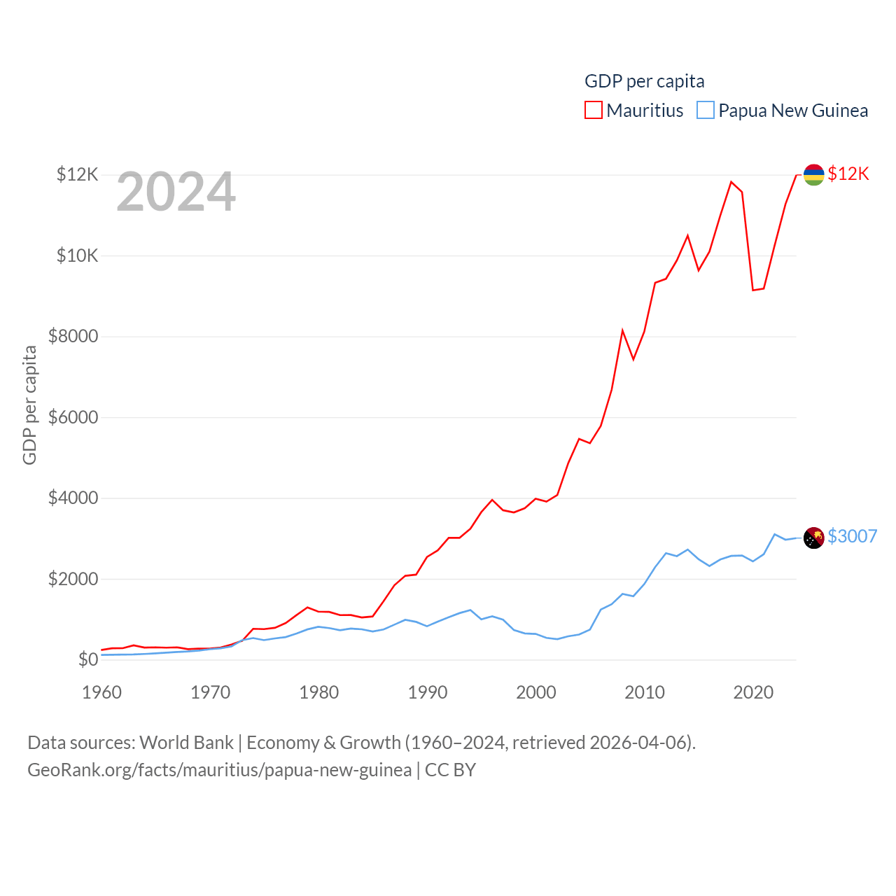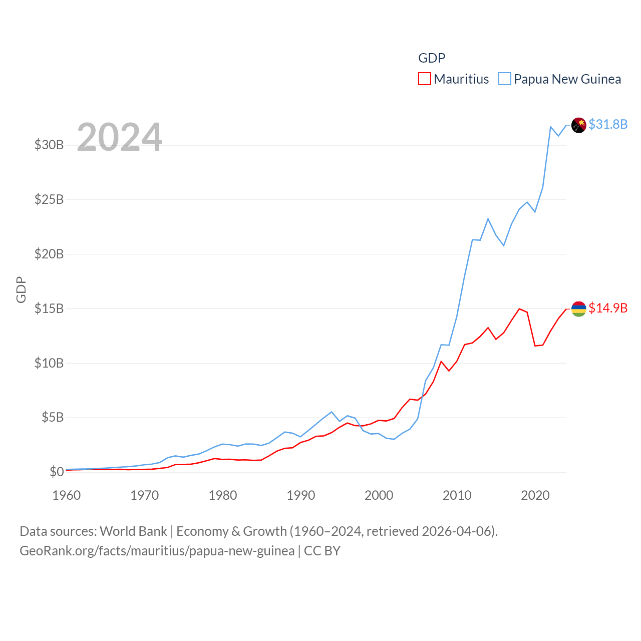 By GDP, Mauritius ranks 143/197 ($14.9B) and Papua New Guinea ranks 110/197 ($31.8B). By GDP per capita, Mauritius ranks 78/197 ($11,991), while Papua New Guinea ranks 140/197 ($3,007).