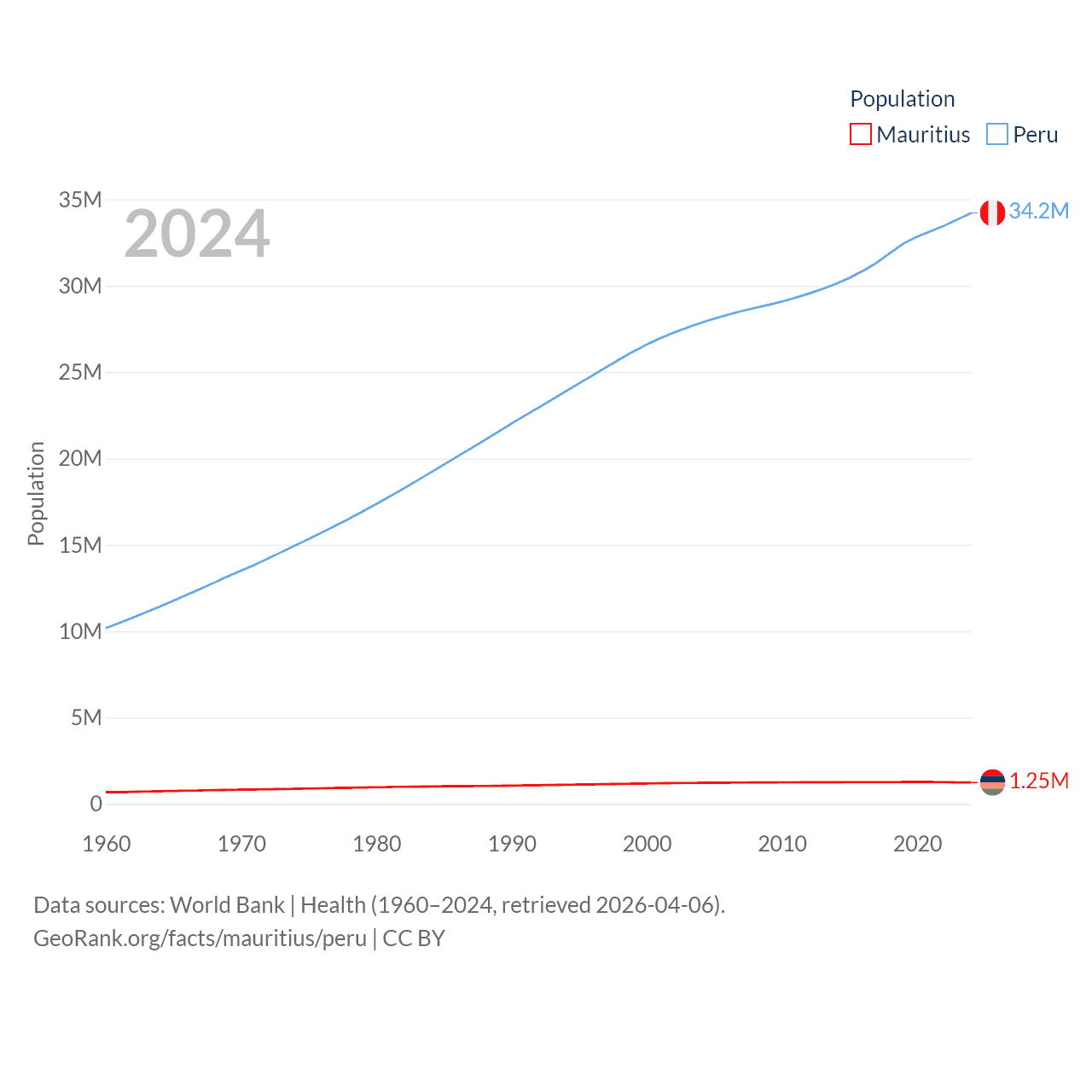 Mauritius has a population of 1.25M (ranked 156/197), compared with 34.2M in Peru (ranked 48/197). Mauritius' land area is 771 sq mi versus 494,211 sq mi for Peru (ranked 170th vs. 19th).