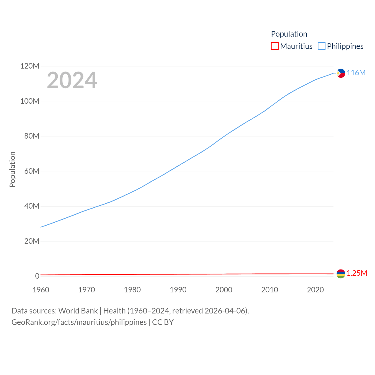 Mauritius has a population of 1.25M (ranked 156/197), compared with 116M in The Philippines (ranked 14/197). Mauritius' land area is 771 sq mi versus 115,124 sq mi for The Philippines (ranked 170th vs. 71st).