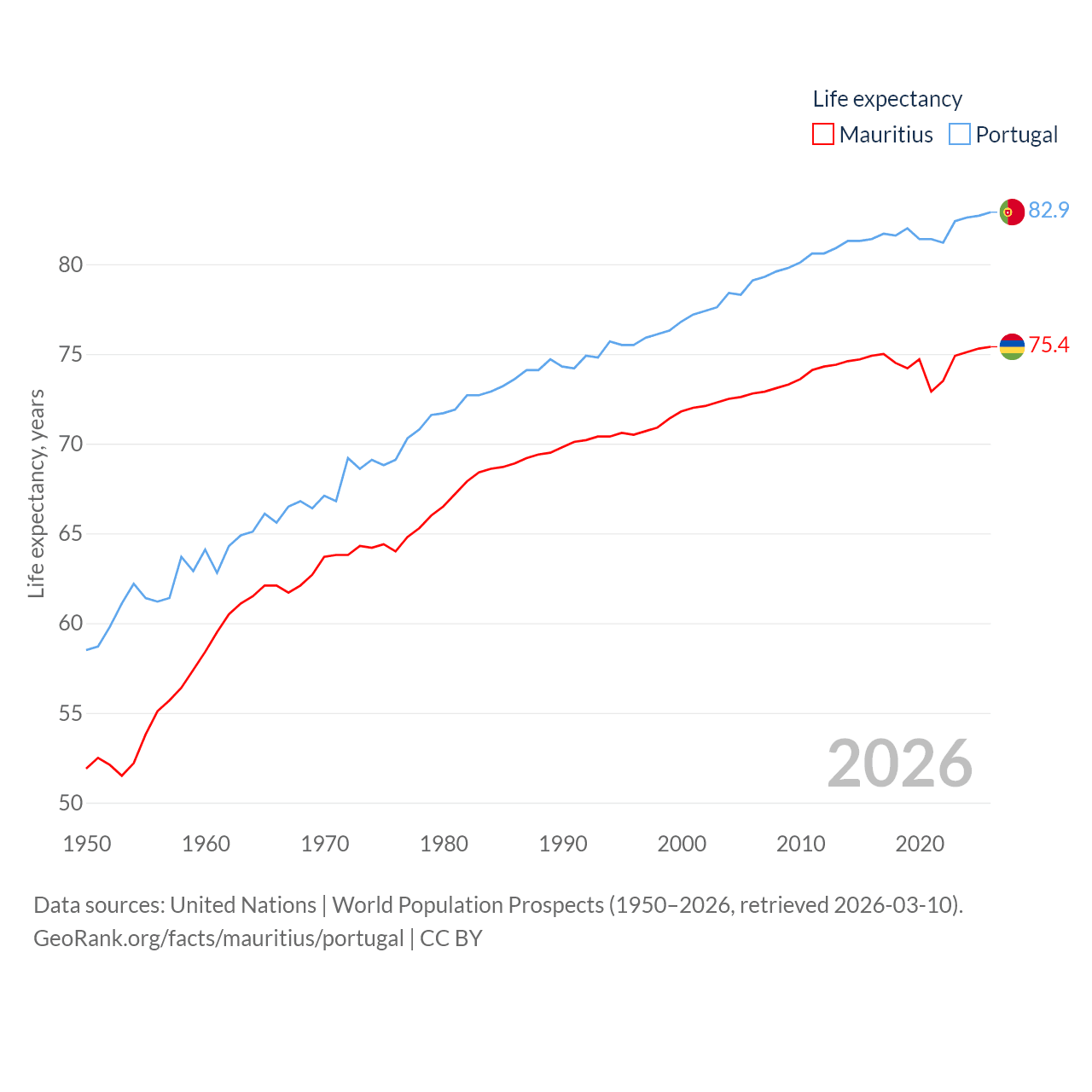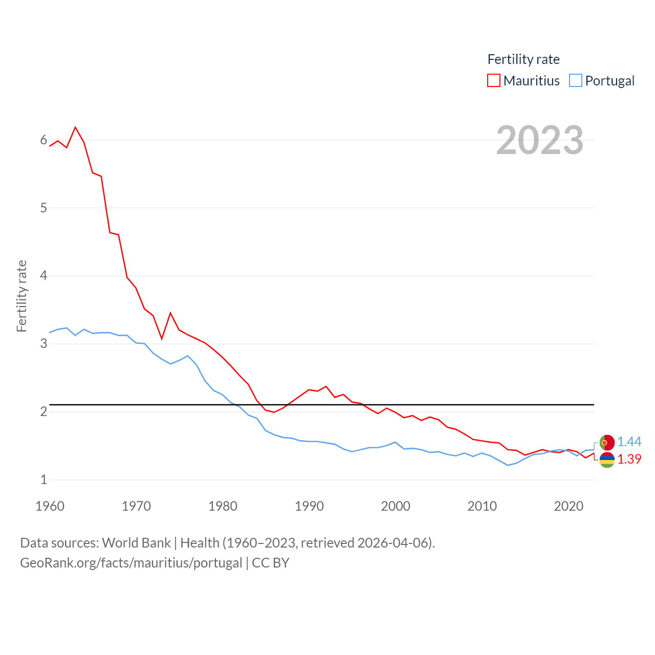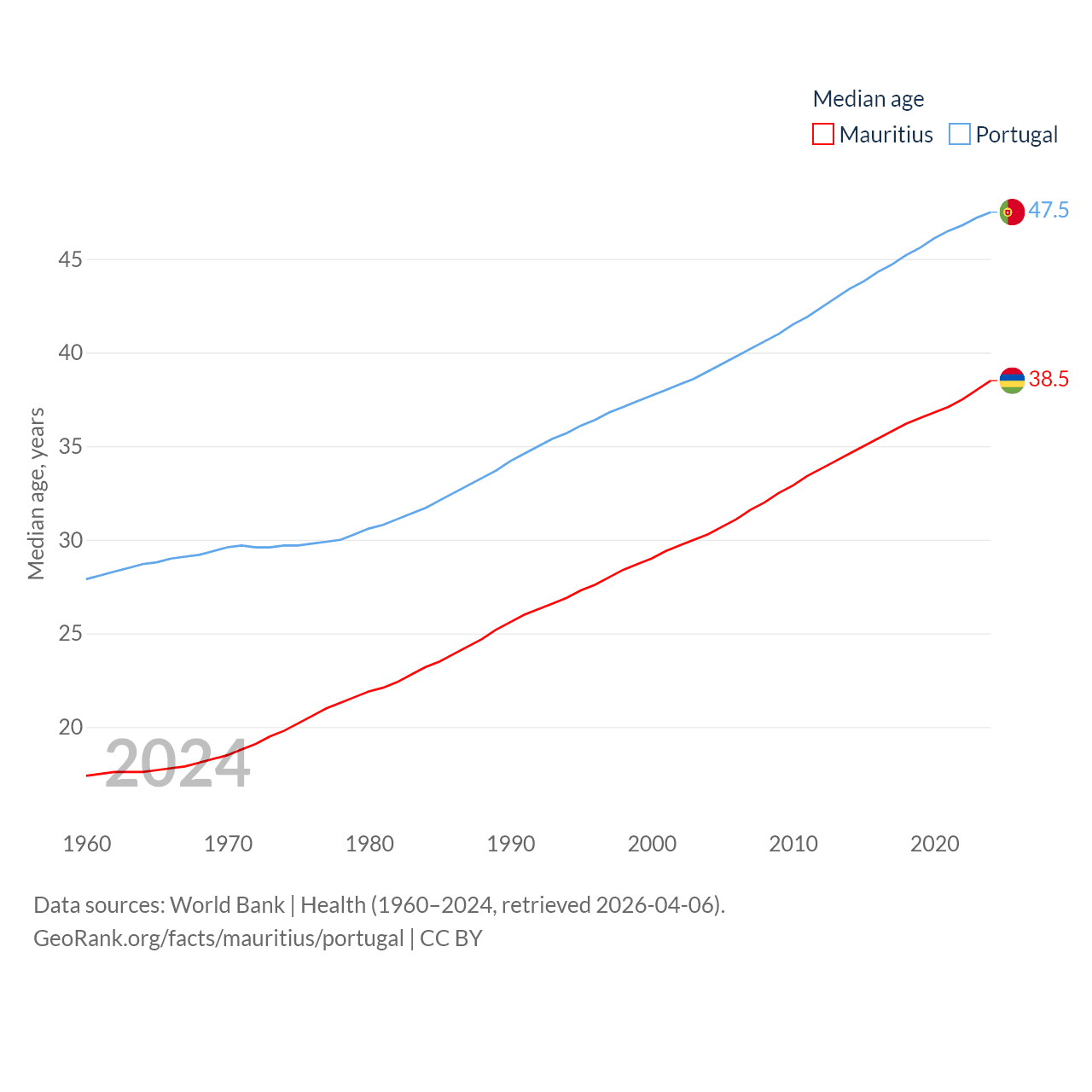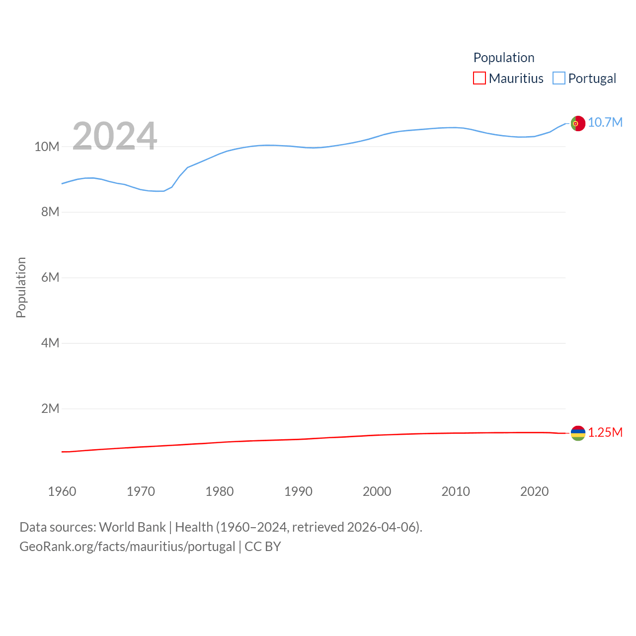 Mauritius has a population of 1.25M (ranked 156/197), compared with 10.7M in Portugal (ranked 90/197). Mauritius' land area is 771 sq mi versus 35,369 sq mi for Portugal (ranked 170th vs. 108th).
