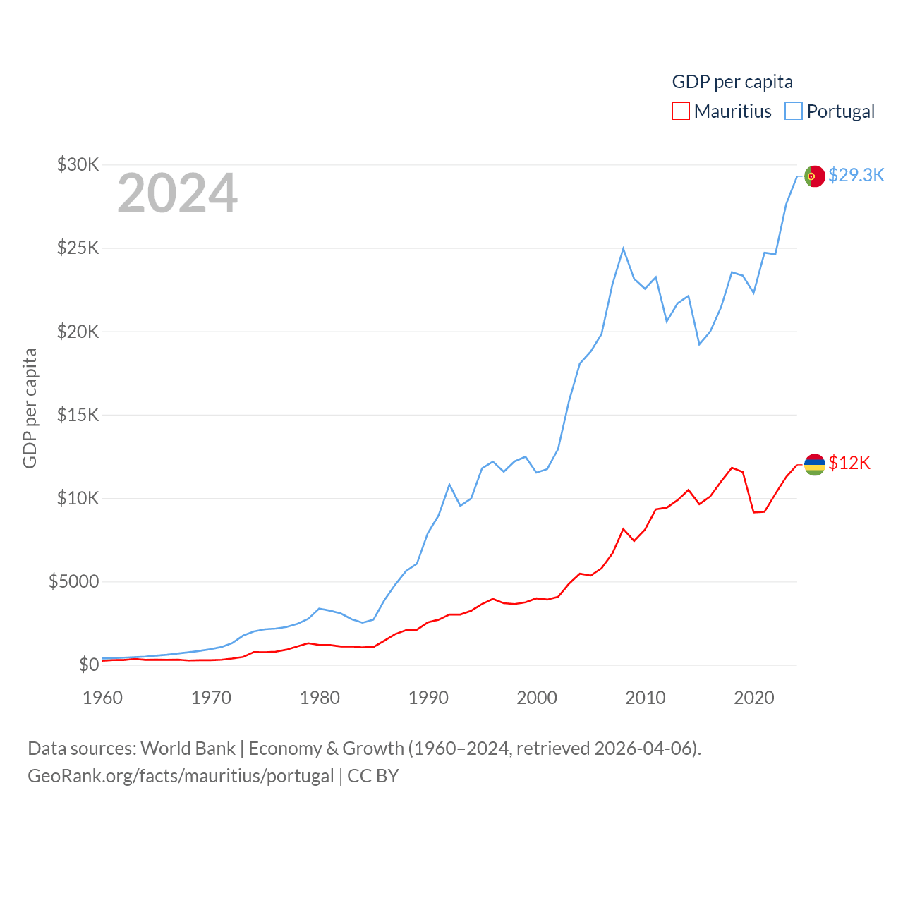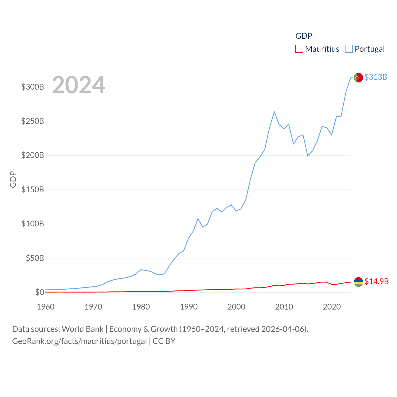 By GDP, Mauritius ranks 143/197 ($14.9B) and Portugal ranks 46/197 ($313B). By GDP per capita, Mauritius ranks 78/197 ($11,991), while Portugal ranks 44/197 ($29,292).