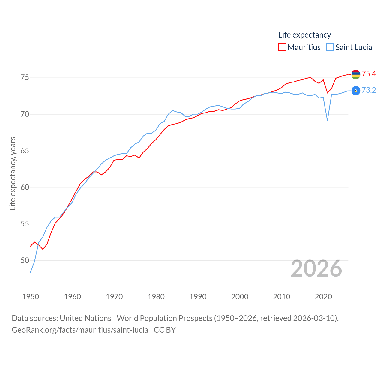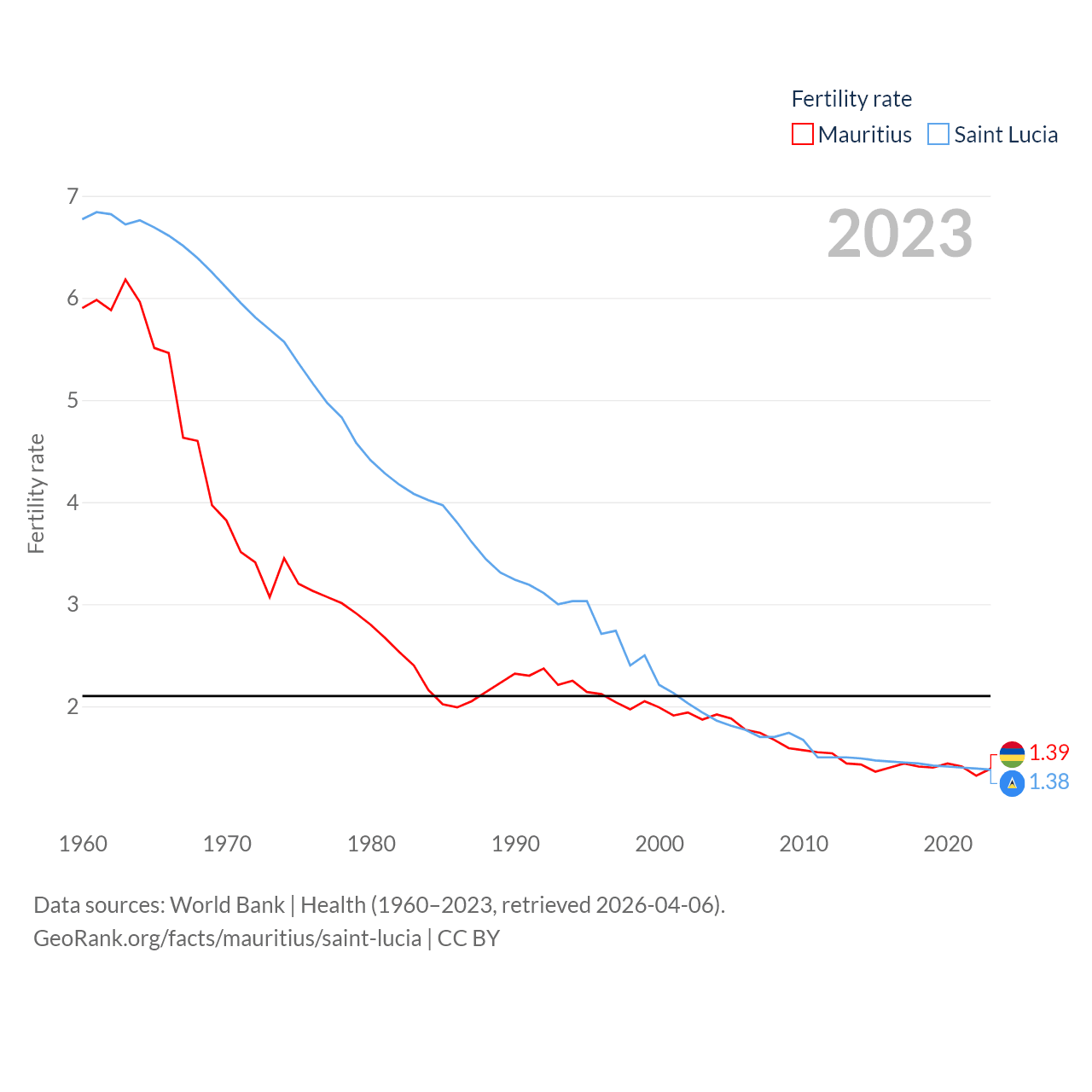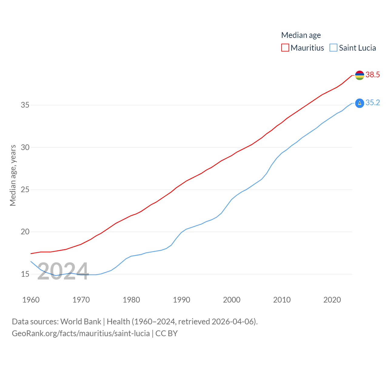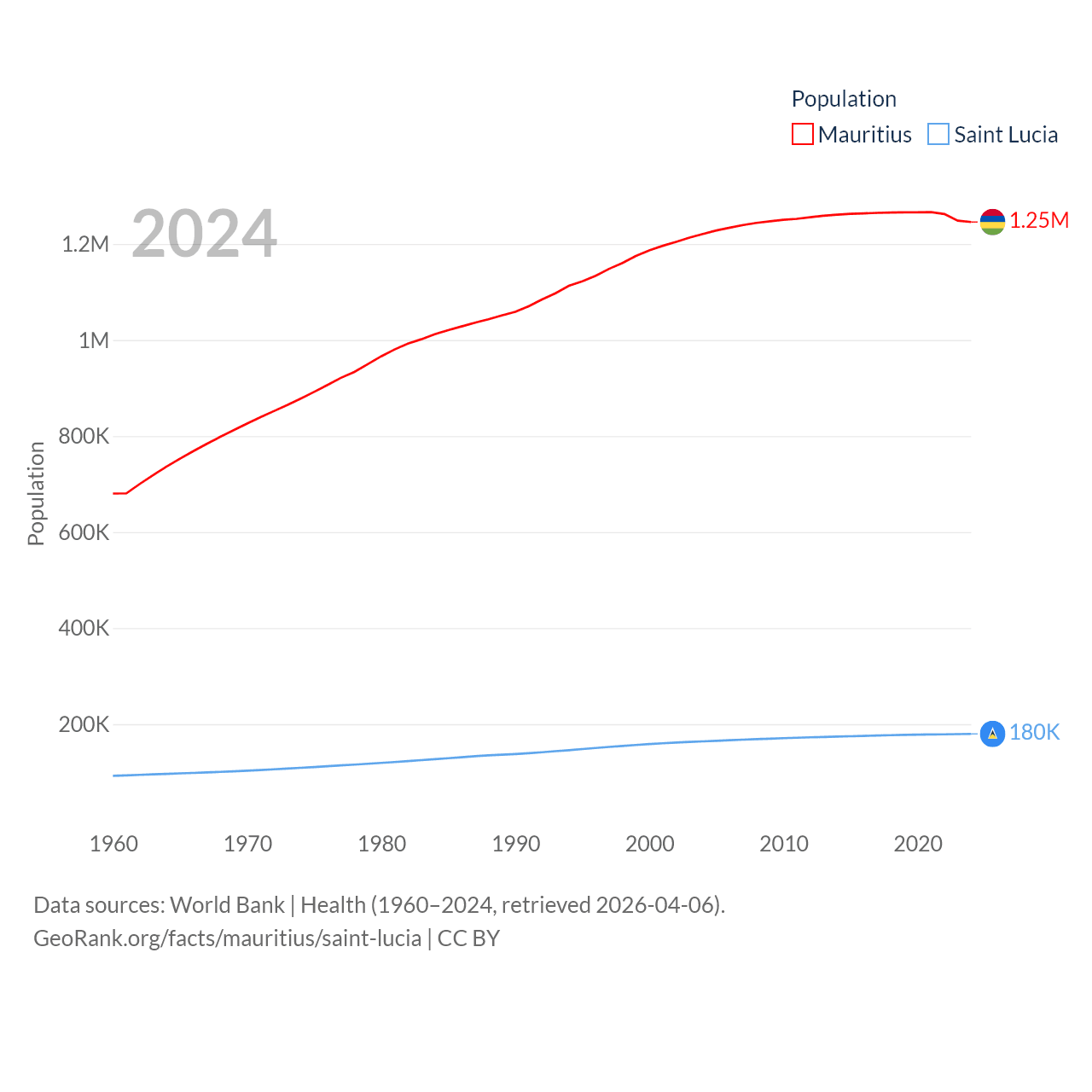 Mauritius has a population of 1.25M (ranked 156/197), compared with 180K in Saint Lucia (ranked 178/197). Mauritius' land area is 771 sq mi versus 235.5 sq mi for Saint Lucia (ranked 170th vs. 178th).