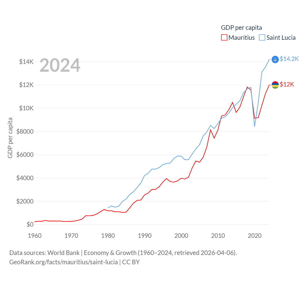By GDP, Mauritius ranks 143/197 ($14.9B) and Saint Lucia ranks 173/197 ($2.55B). By GDP per capita, Mauritius ranks 78/197 ($11,991), while Saint Lucia ranks 70/197 ($14,182).