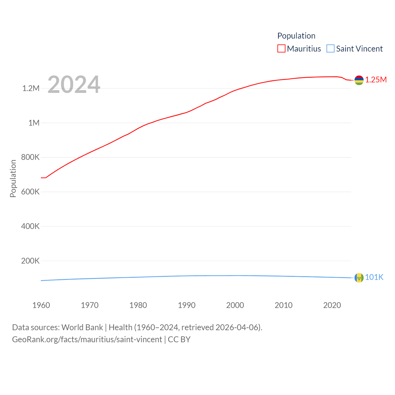 Mauritius has a population of 1.25M (ranked 156/197), compared with 101K in Saint Vincent (ranked 184/197). Mauritius' land area is 771 sq mi versus 150.6 sq mi for Saint Vincent (ranked 170th vs. 185th).