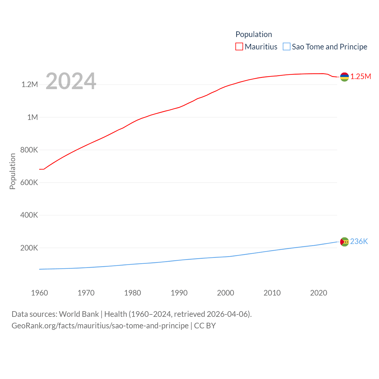 Mauritius has a population of 1.25M (ranked 156/197), compared with 236K in Sao Tome and Principe (ranked 176/197). Mauritius' land area is 771 sq mi versus 371 sq mi for Sao Tome and Principe (ranked 170th vs. 172nd).