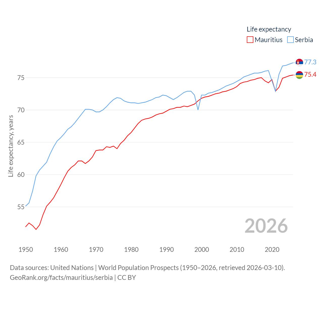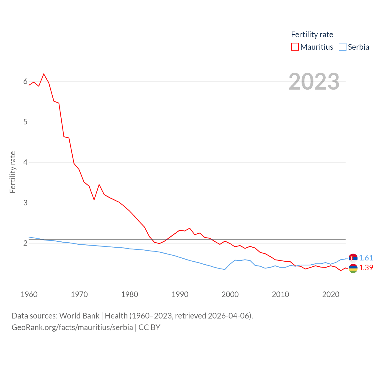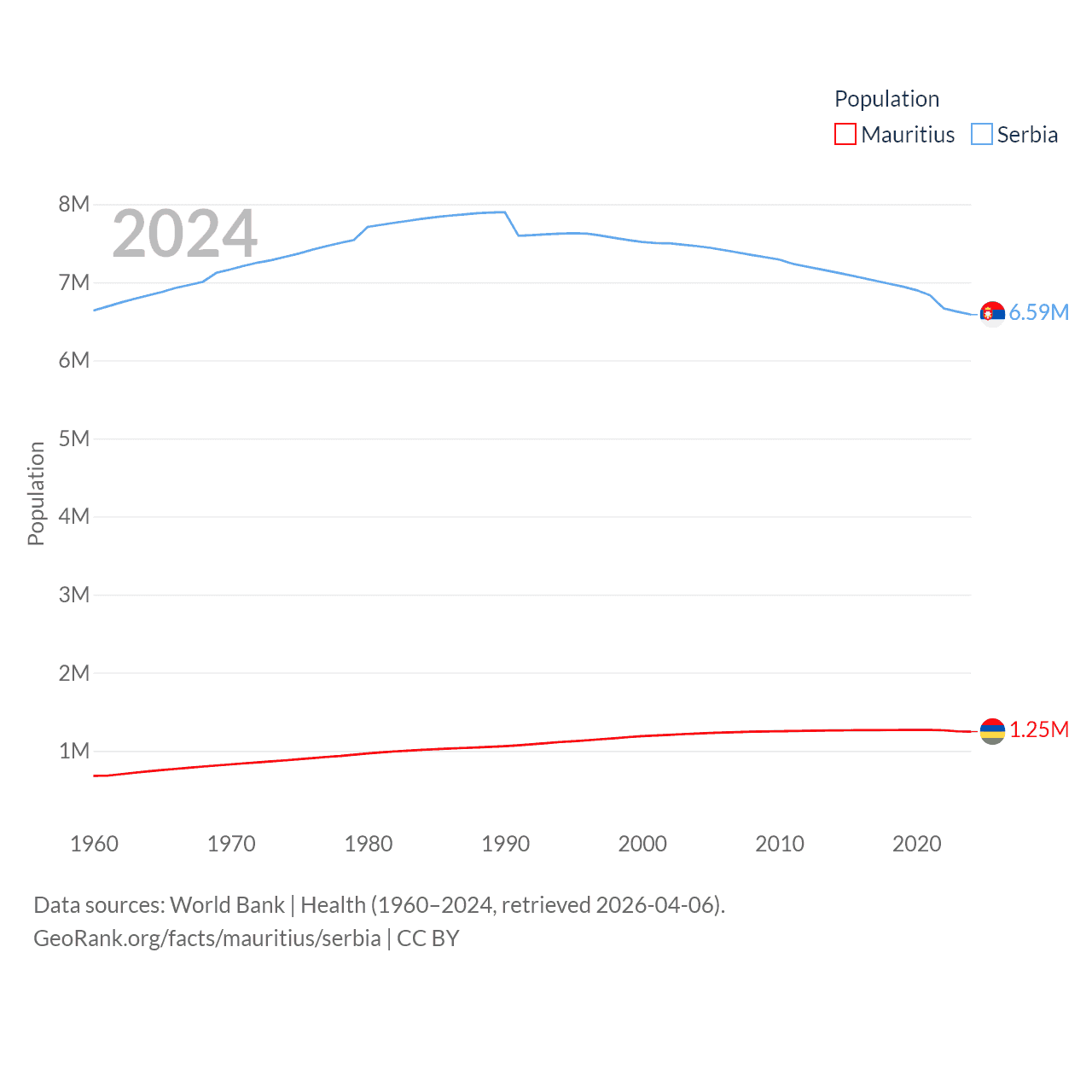 Mauritius has a population of 1.25M (ranked 156/197), compared with 6.59M in Serbia (ranked 109/197). Mauritius' land area is 771 sq mi versus 32,467 sq mi for Serbia (ranked 170th vs. 111th).