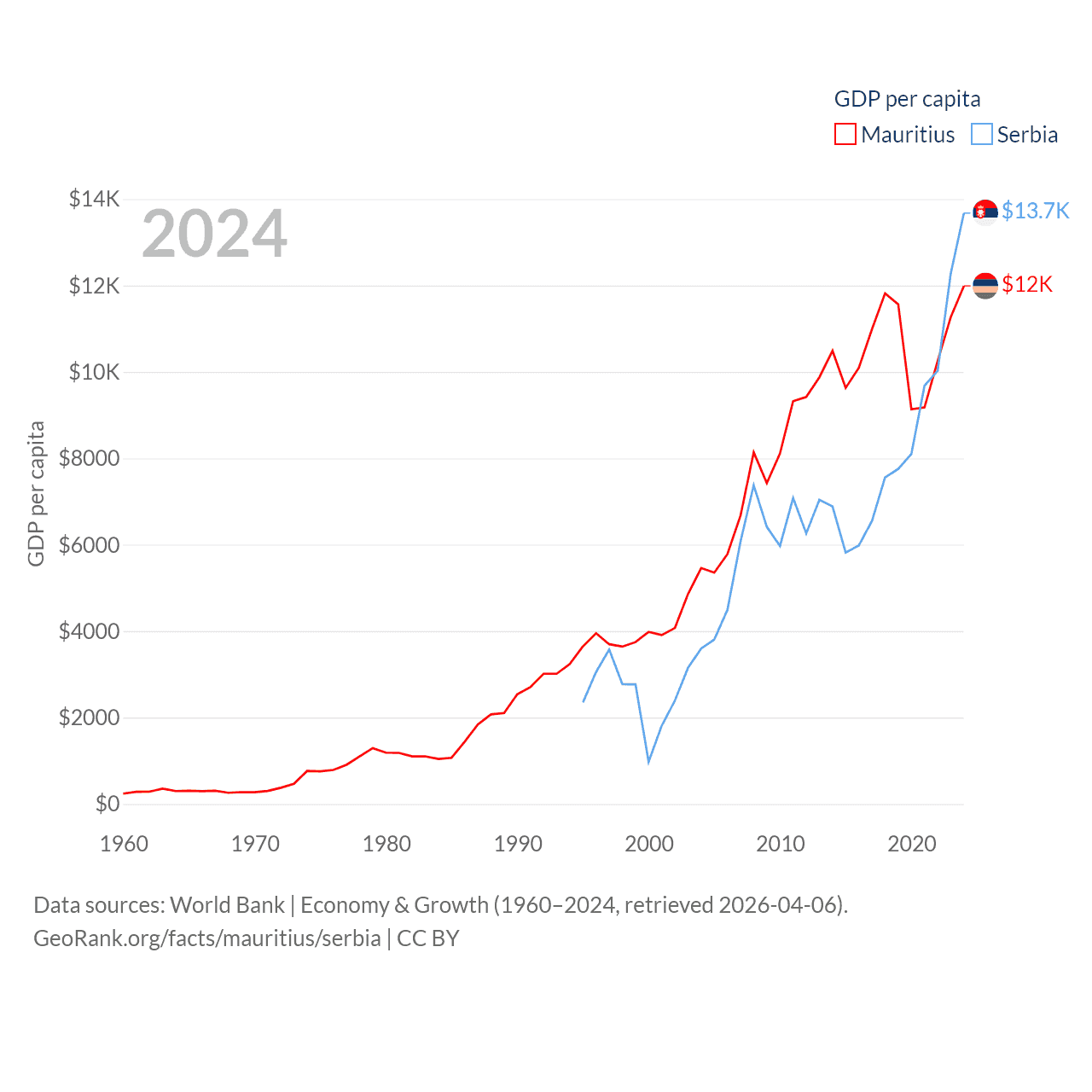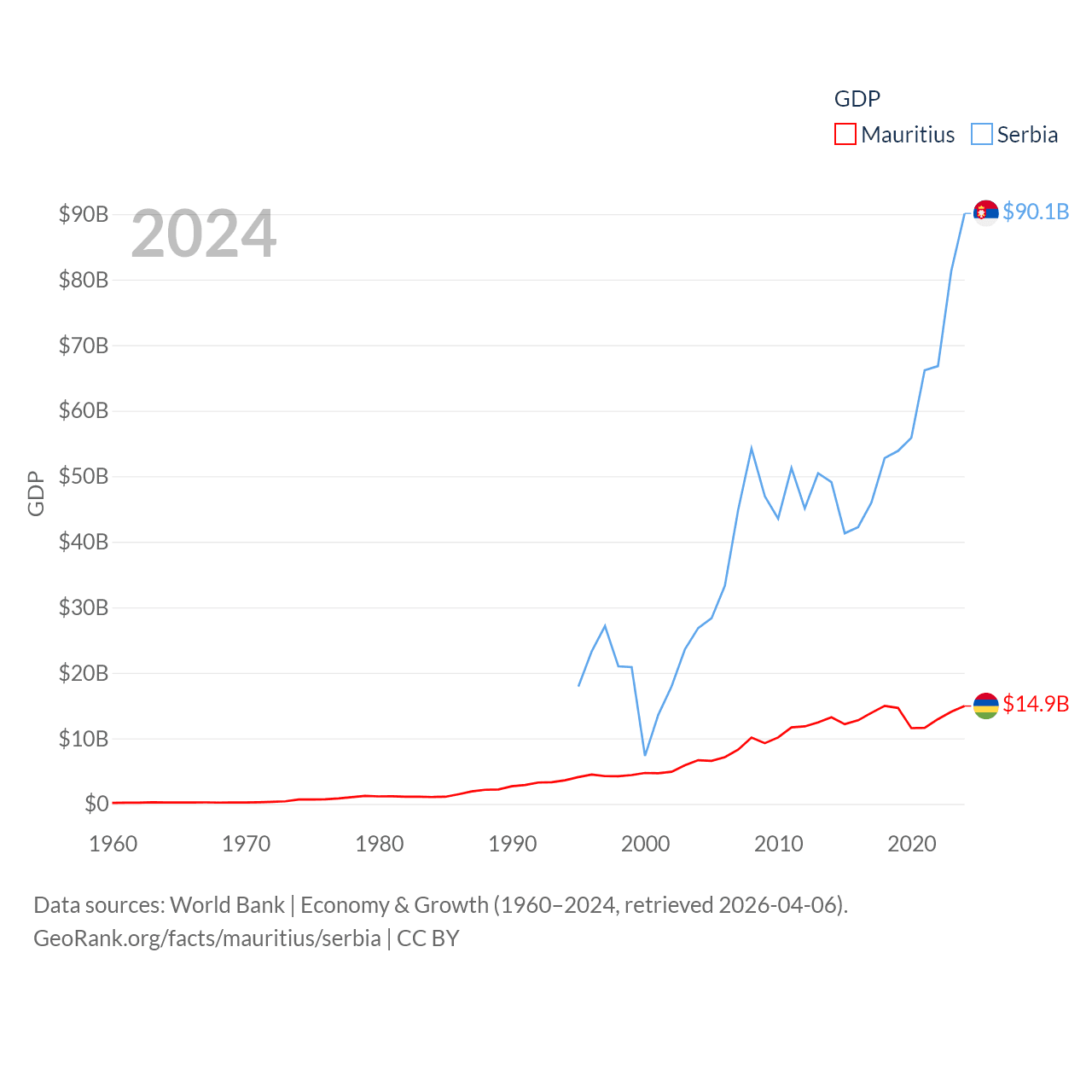 By GDP, Mauritius ranks 143/197 ($14.9B) and Serbia ranks 76/197 ($90.1B). By GDP per capita, Mauritius ranks 78/197 ($11,991), while Serbia ranks 73/197 ($13,679).