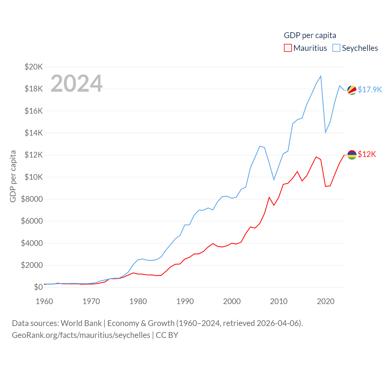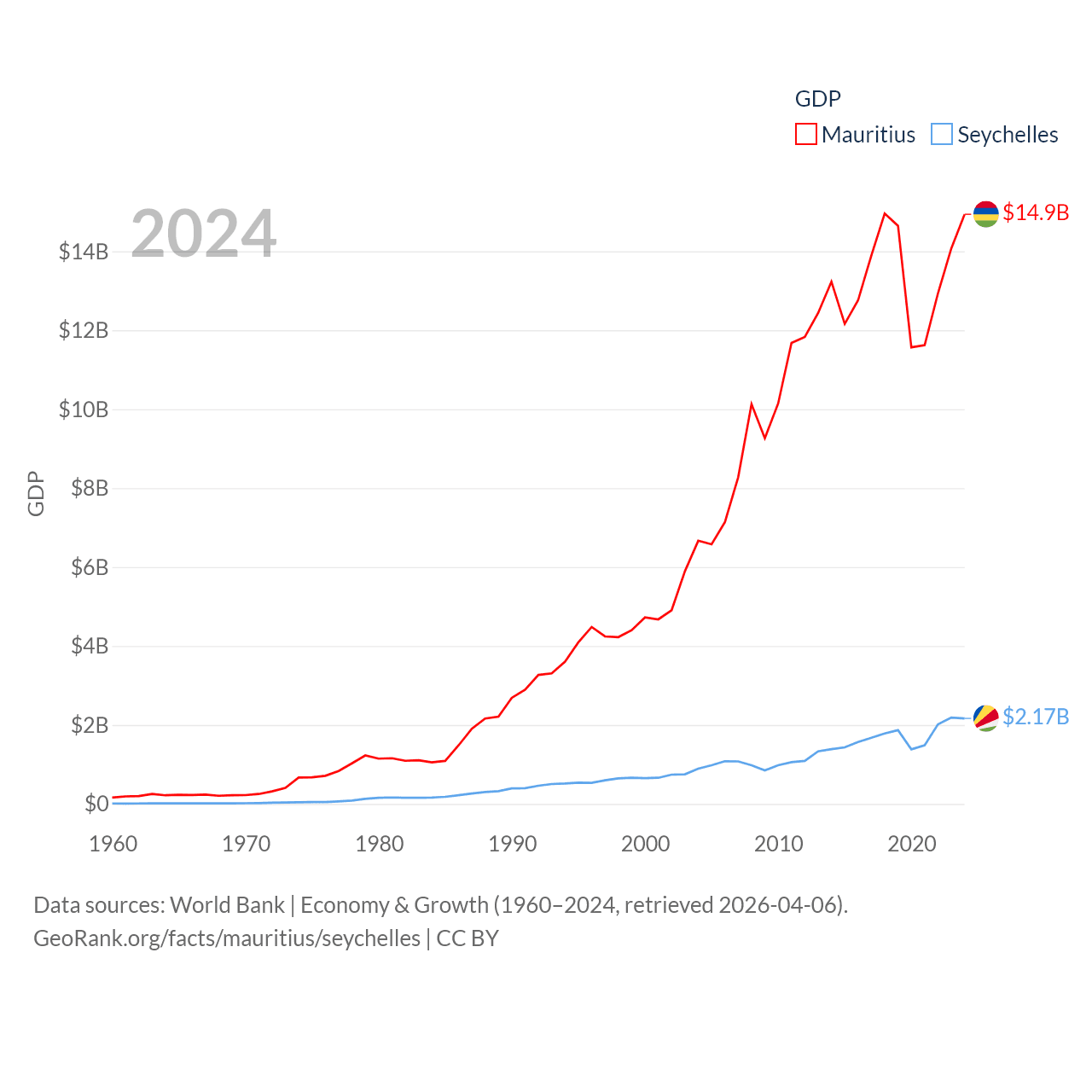 By GDP, Mauritius ranks 143/197 ($14.9B) and The Seychelles ranks 178/197 ($2.17B). By GDP per capita, Mauritius ranks 78/197 ($11,991), while The Seychelles ranks 63/197 ($17,859).