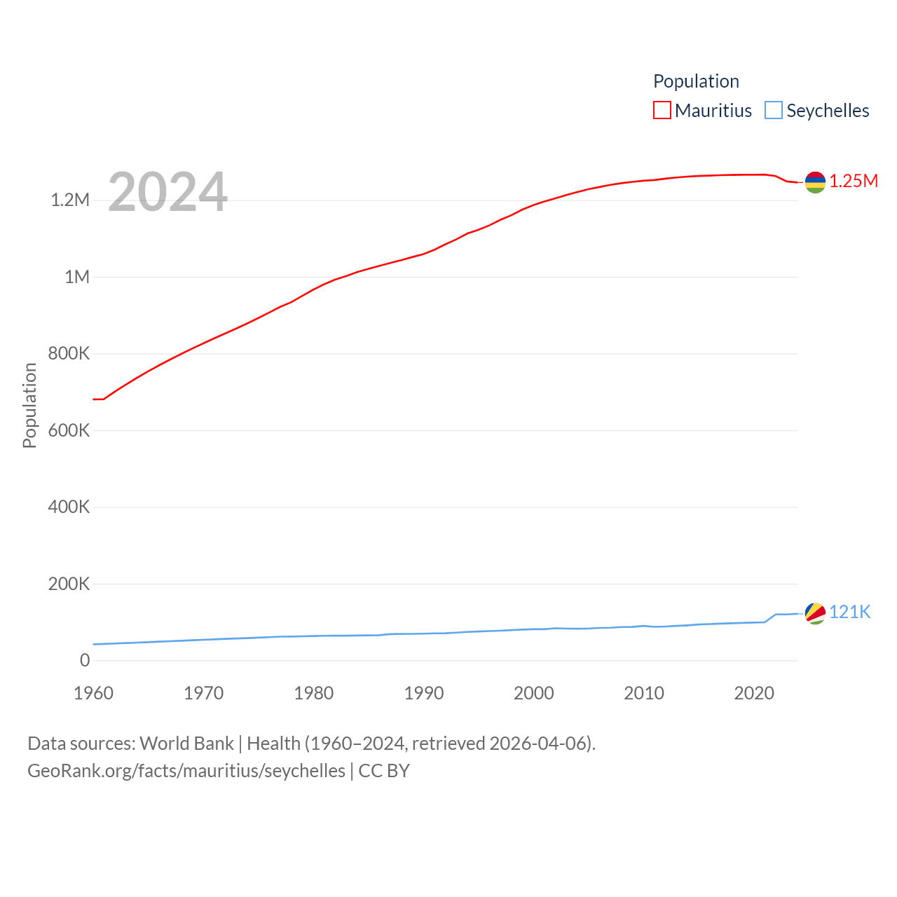 Mauritius has a population of 1.25M (ranked 156/197), compared with 121K in The Seychelles (ranked 181/197). Mauritius' land area is 771 sq mi versus 177.6 sq mi for The Seychelles (ranked 170th vs. 181st).