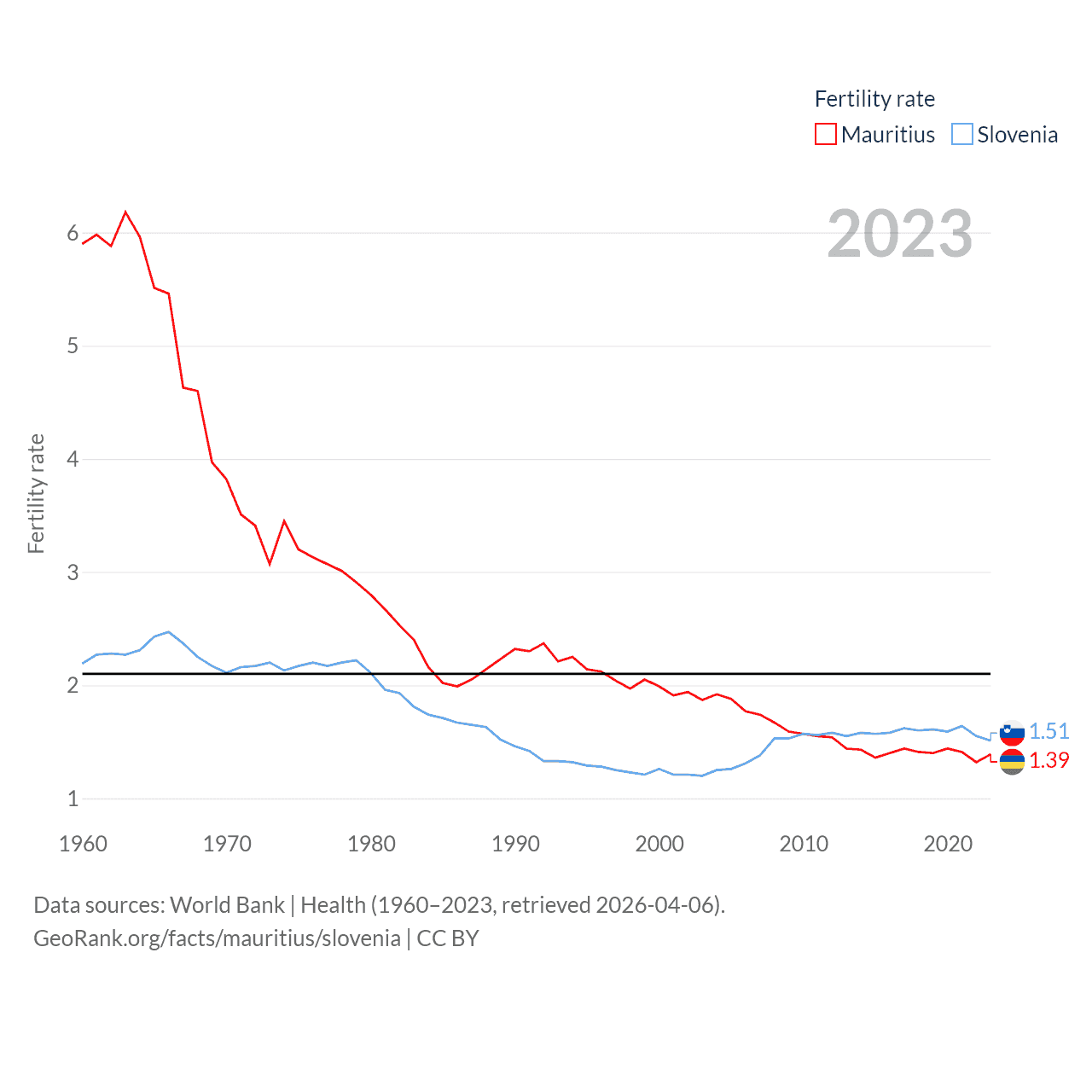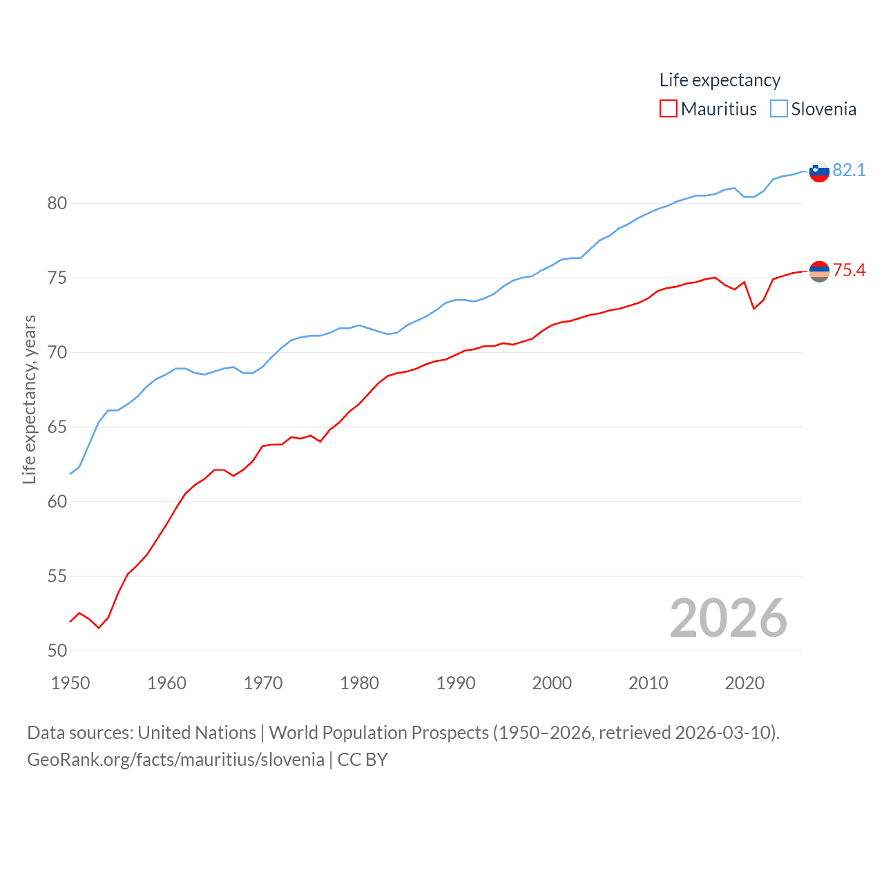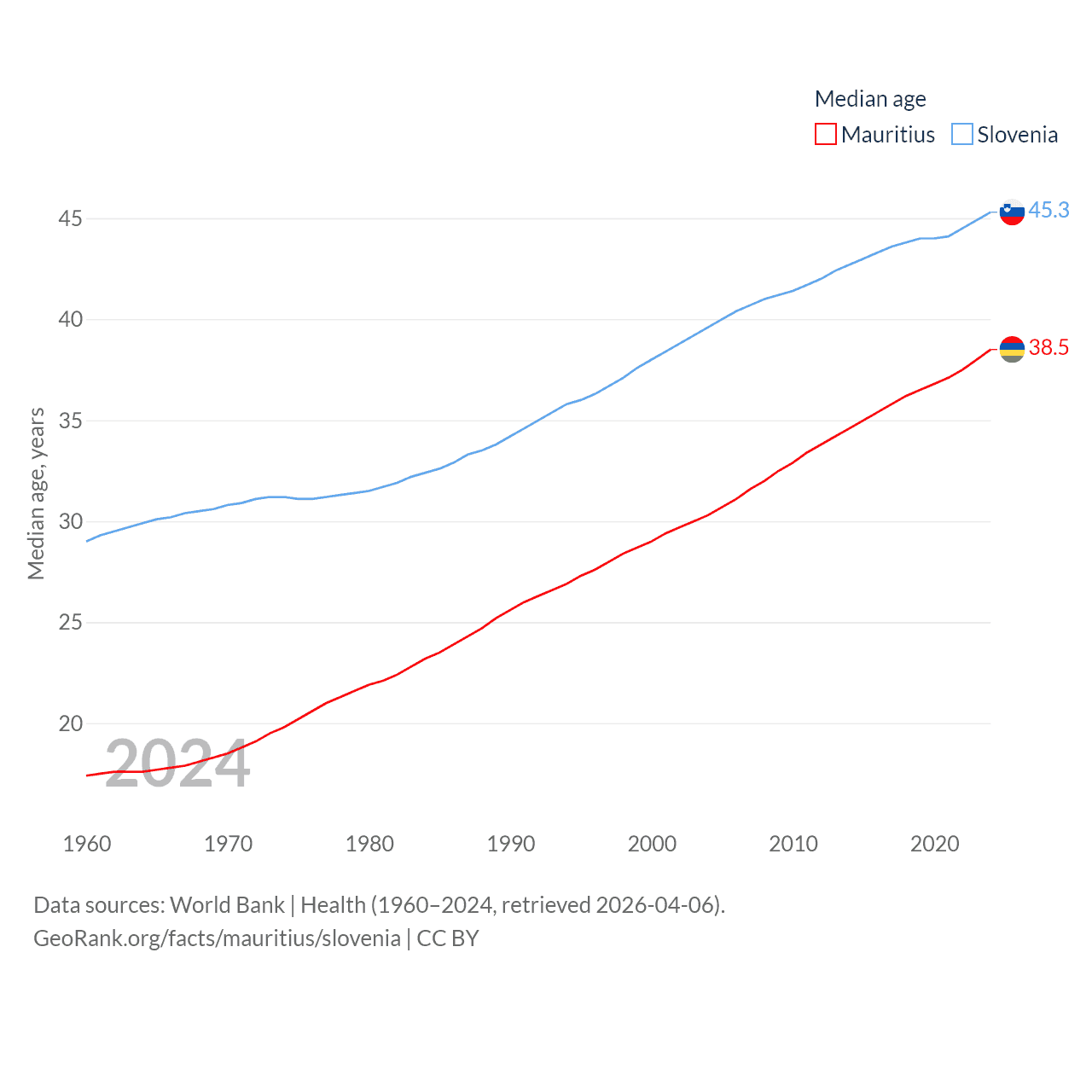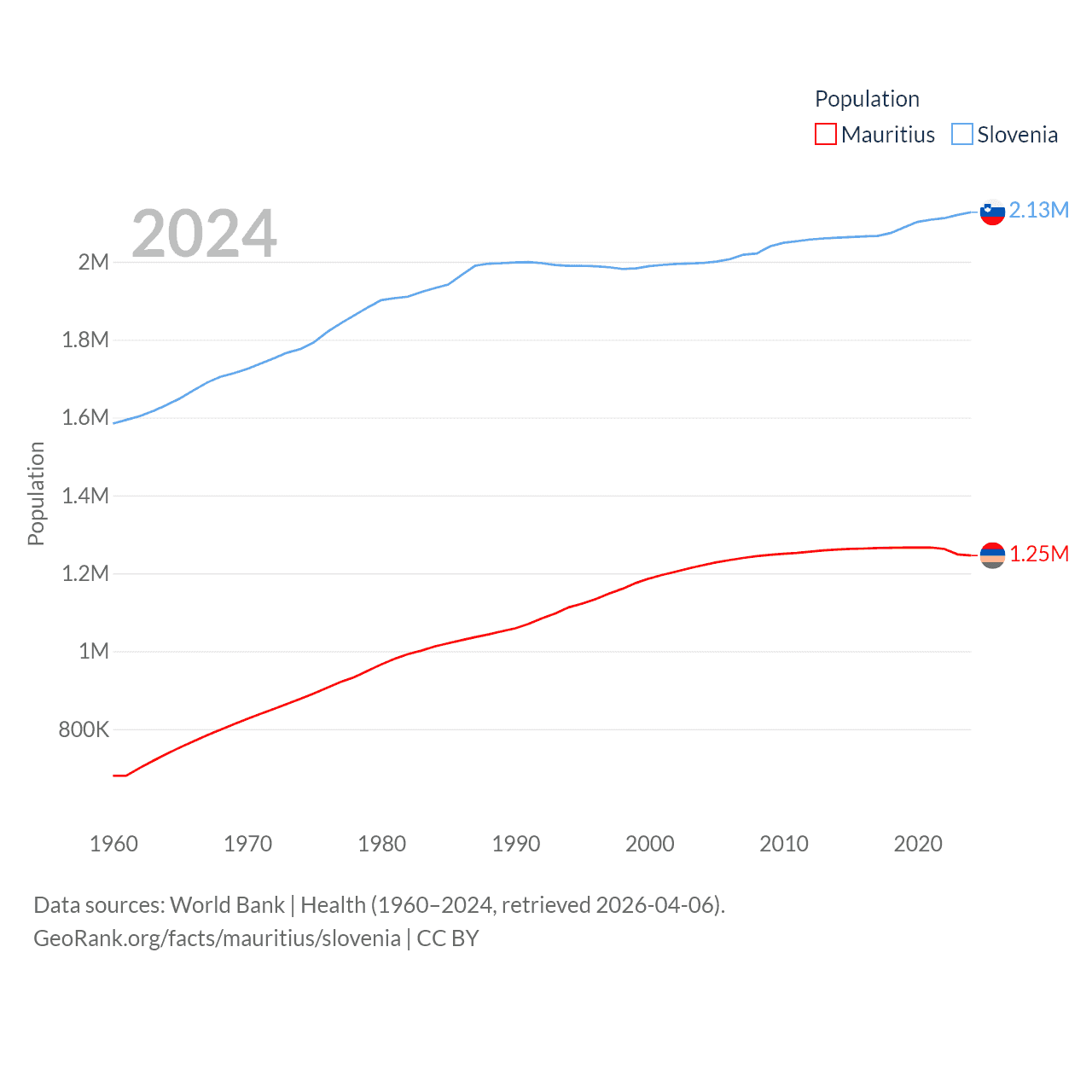 Mauritius has a population of 1.25M (ranked 156/197), compared with 2.13M in Slovenia (ranked 147/197). Mauritius' land area is 771 sq mi versus 7,774 sq mi for Slovenia (ranked 170th vs. 151st).