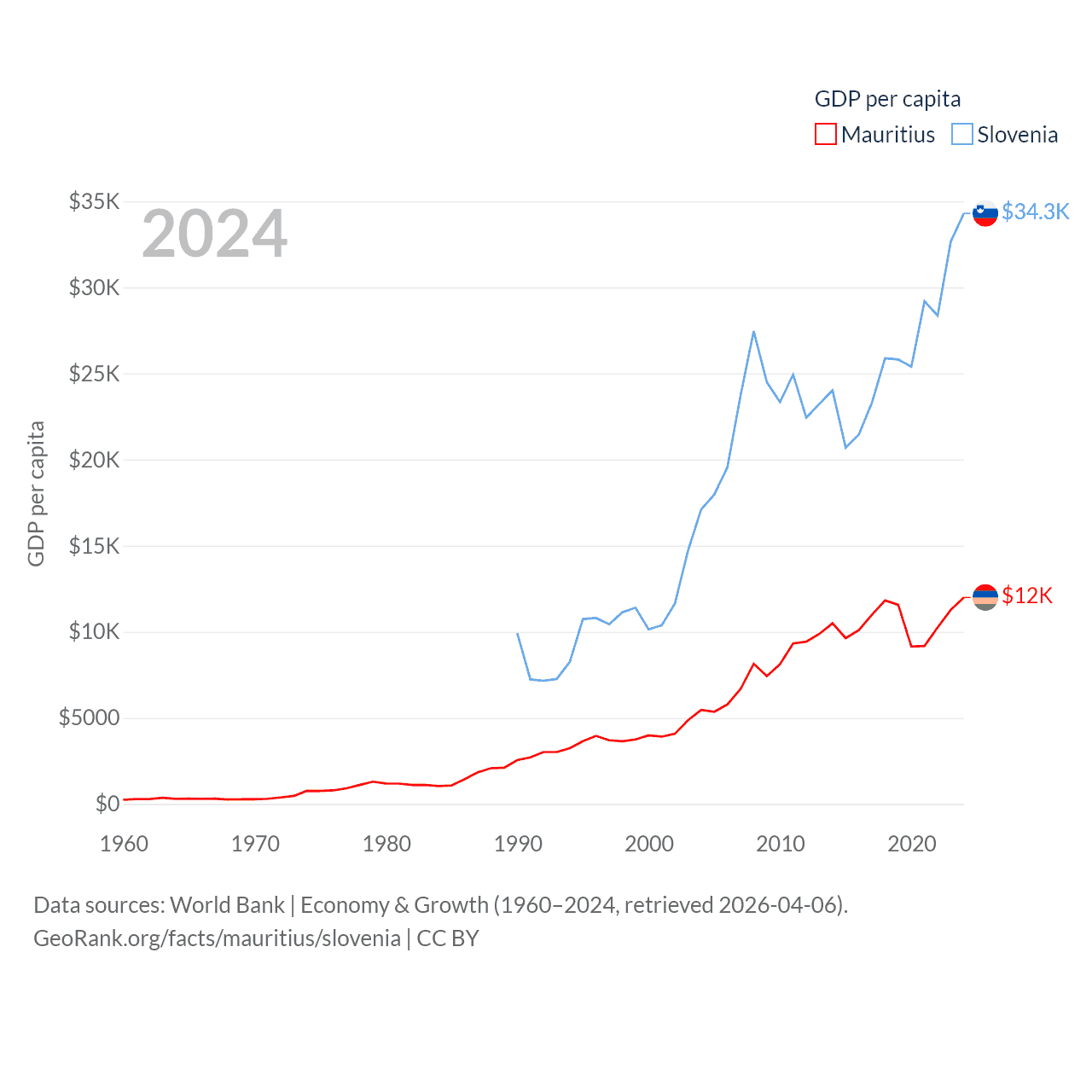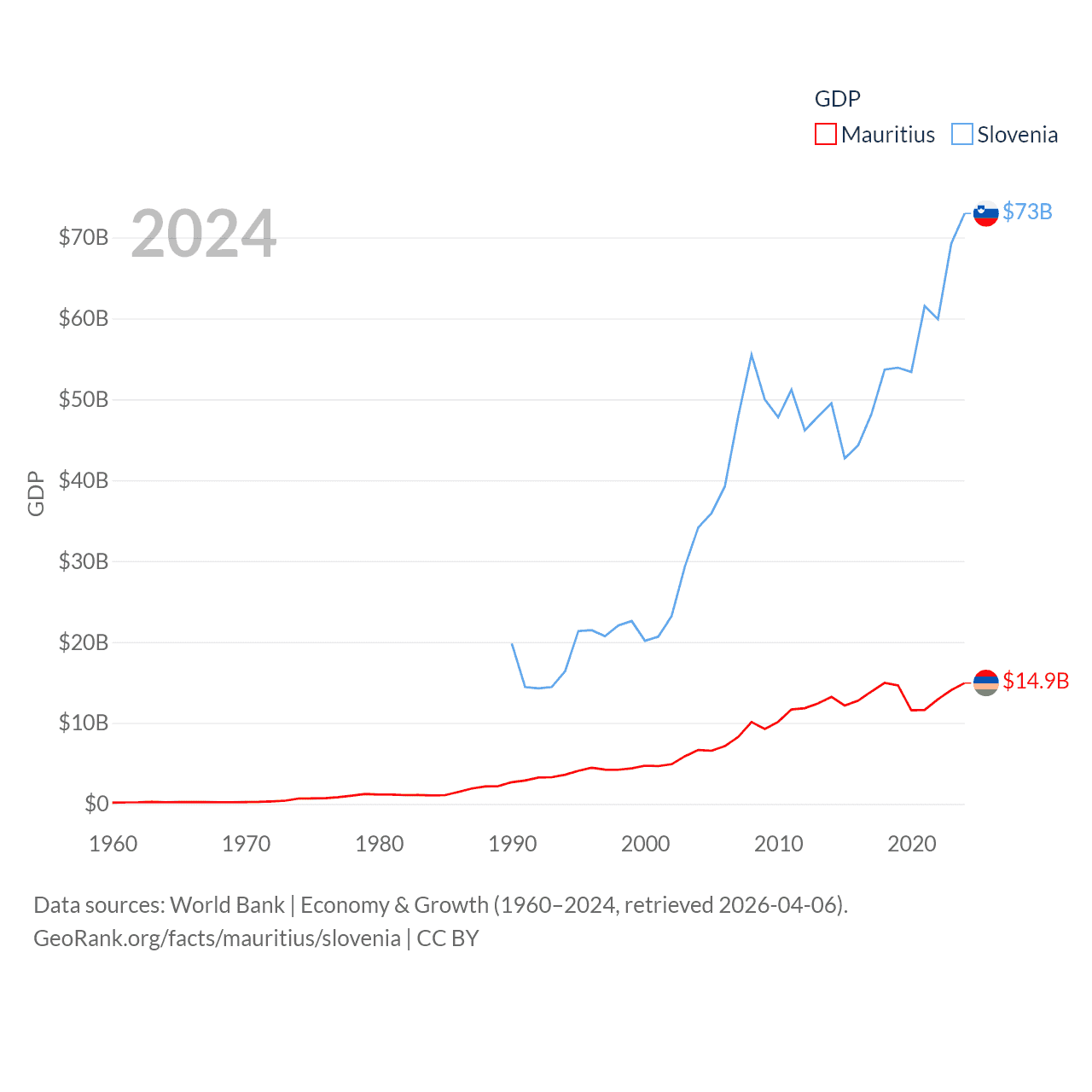 By GDP, Mauritius ranks 143/197 ($14.9B) and Slovenia ranks 86/197 ($73B). By GDP per capita, Mauritius ranks 78/197 ($11,991), while Slovenia ranks 34/197 ($34,301).